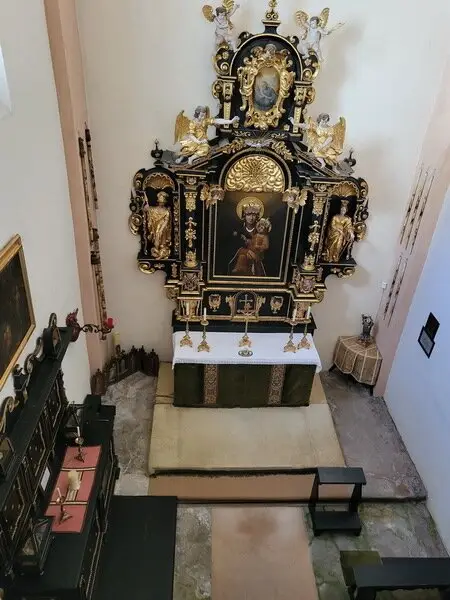 Ein Kalvarienberg mit historischen Statuen markiert die Zufahrt und unterstreicht die einzigartige historische Atmosphäre des Anwesens.