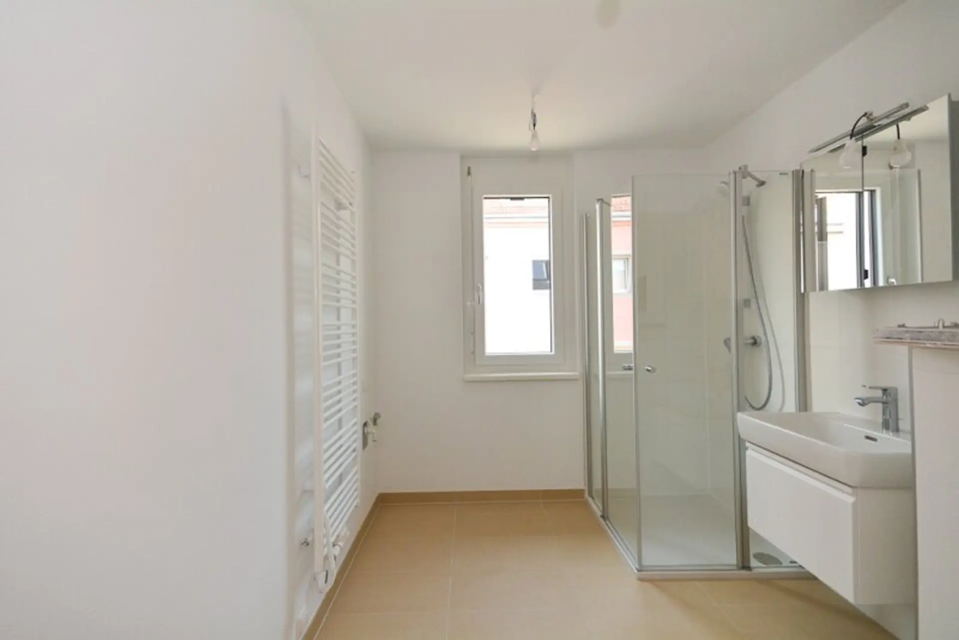 * Die Bäder sind jeweils mit zeitlosen Fliesen, Dusche, WC und Waschbecken mit Unterschrank ausgestattet und haben zudem auch eine Möglichkeit zur direkten Belüftung mit einem Fenster.