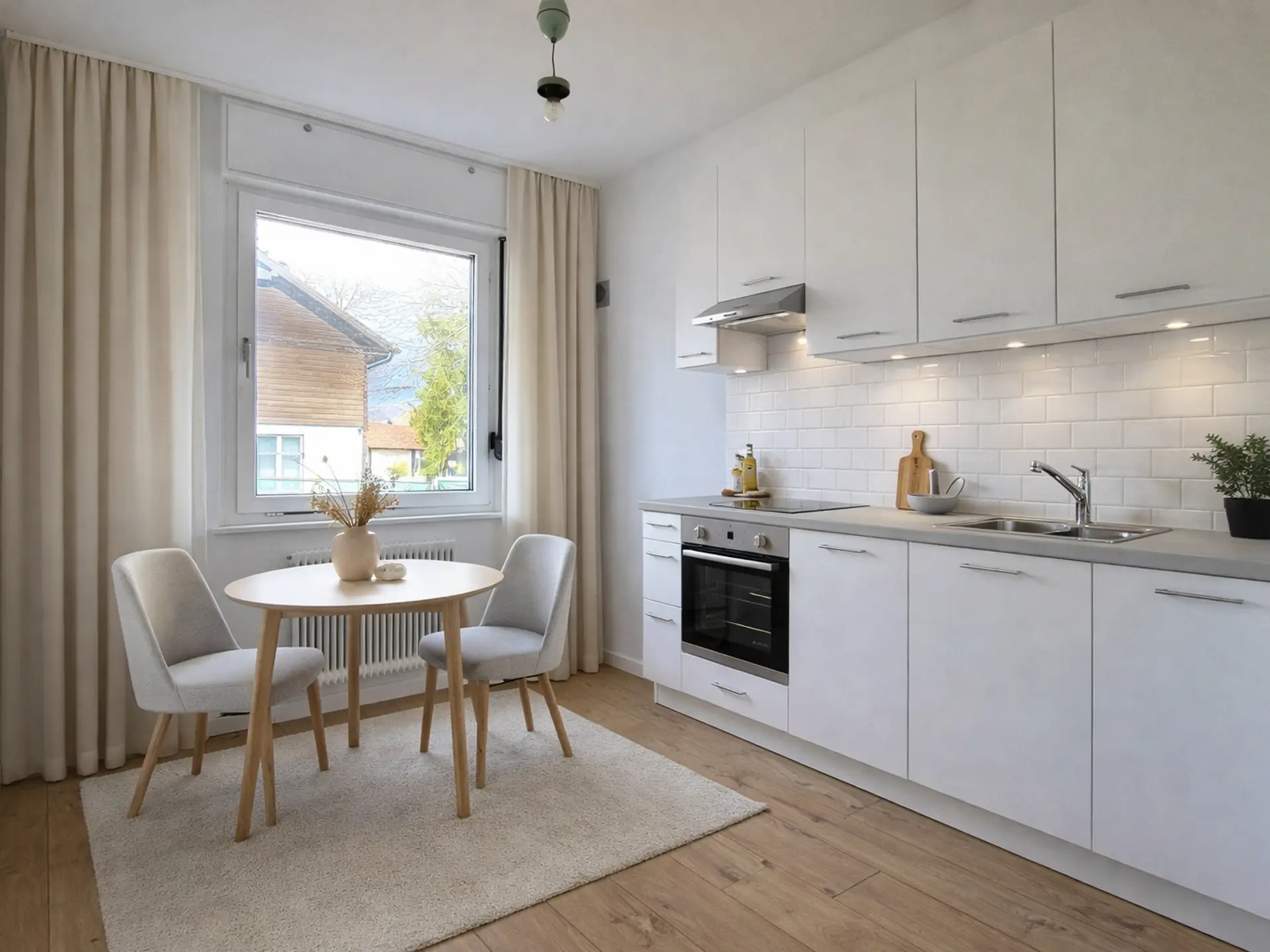 Zentral begehbare Raumaufteilung: Vorraum, Abstellraum, Bad, separates WC, Küche mit wahlweisem Gas- oder 3-Phasen Stromanschluss, Wohnzimmer mit großen Fensterflächen Zugang zur Südost-Loggia mit Blick ins Grüne, 2 weitere Schlafzimmer, Hochwertige neu geschliffene Parkettböden in den Wohnräumen, neue Wandbeläge, Holzfenster mit Außen-Rollläden.