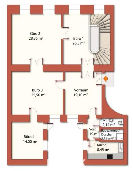 Büro 1 & 2 mit Parkettboden 26m² bzw. 14m²