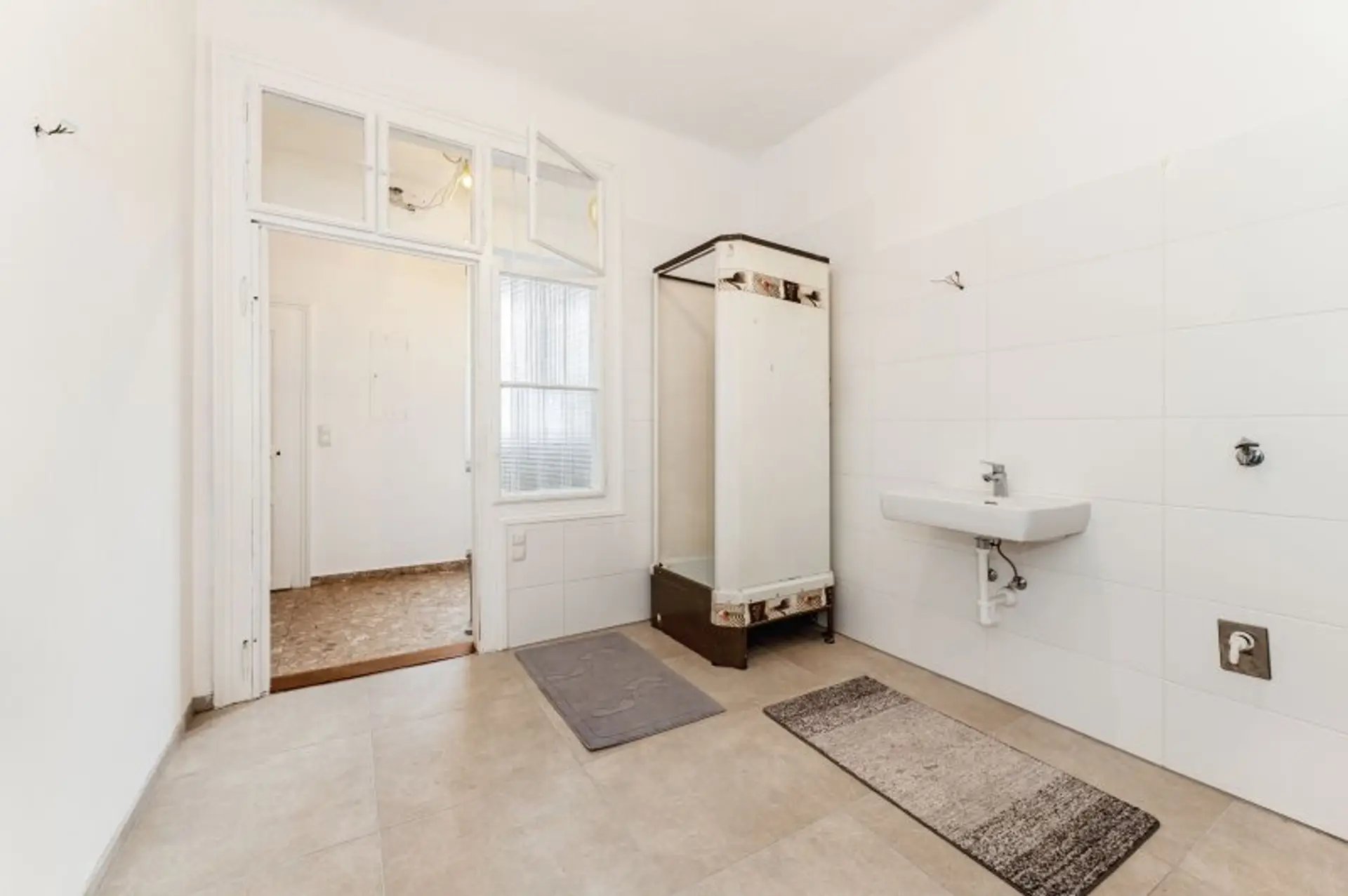 - Badezimmer mit Dusche, Waschbecken und Waschmaschinenanschluss