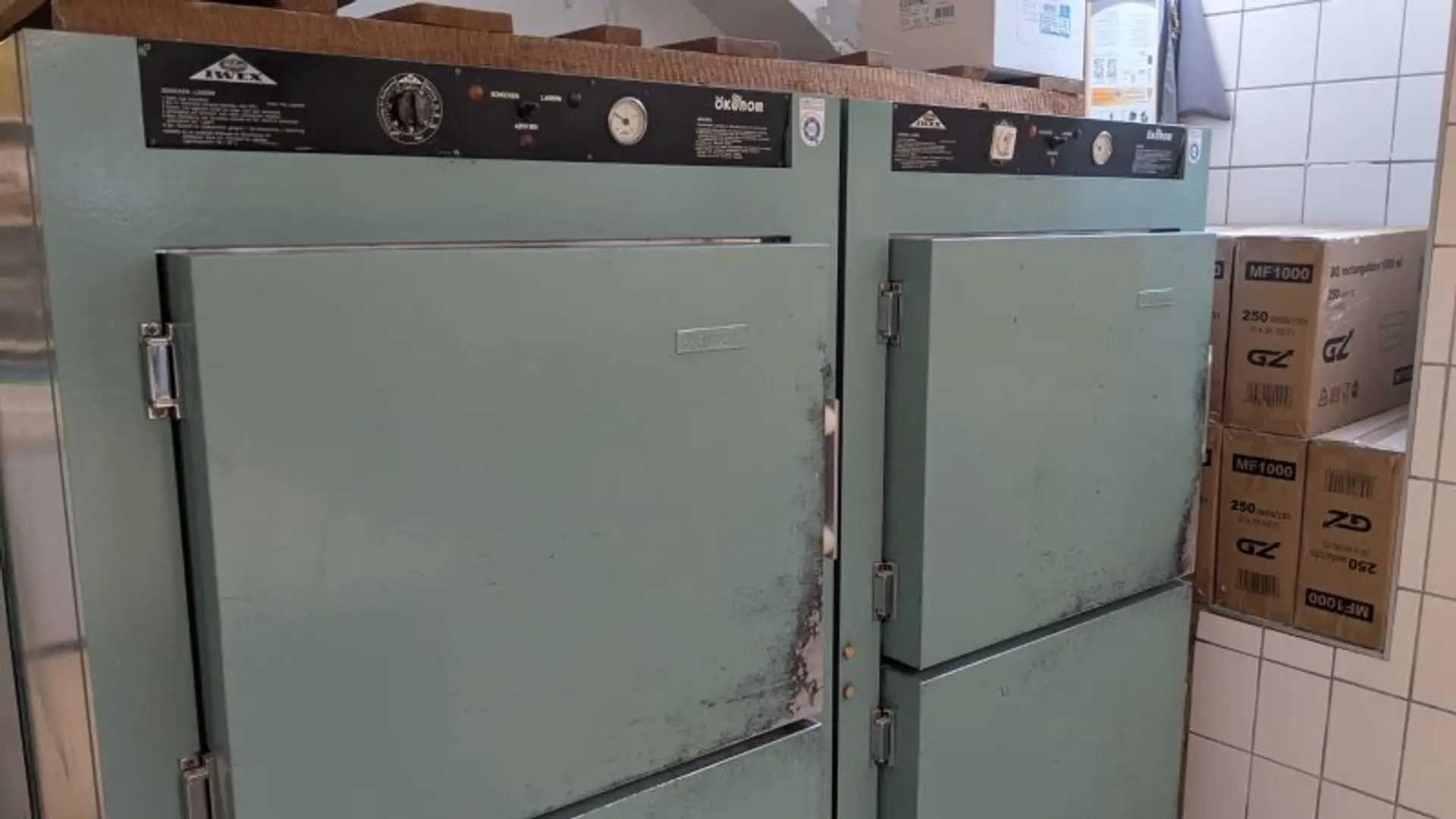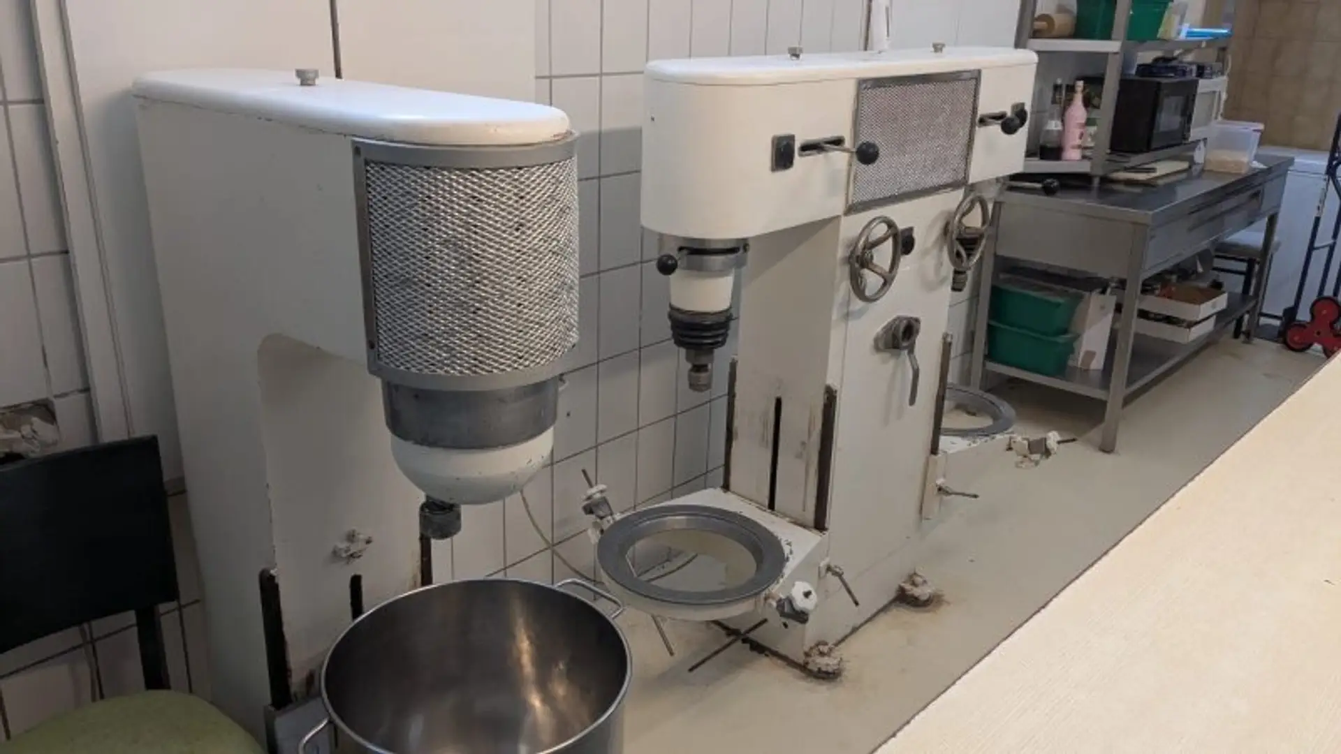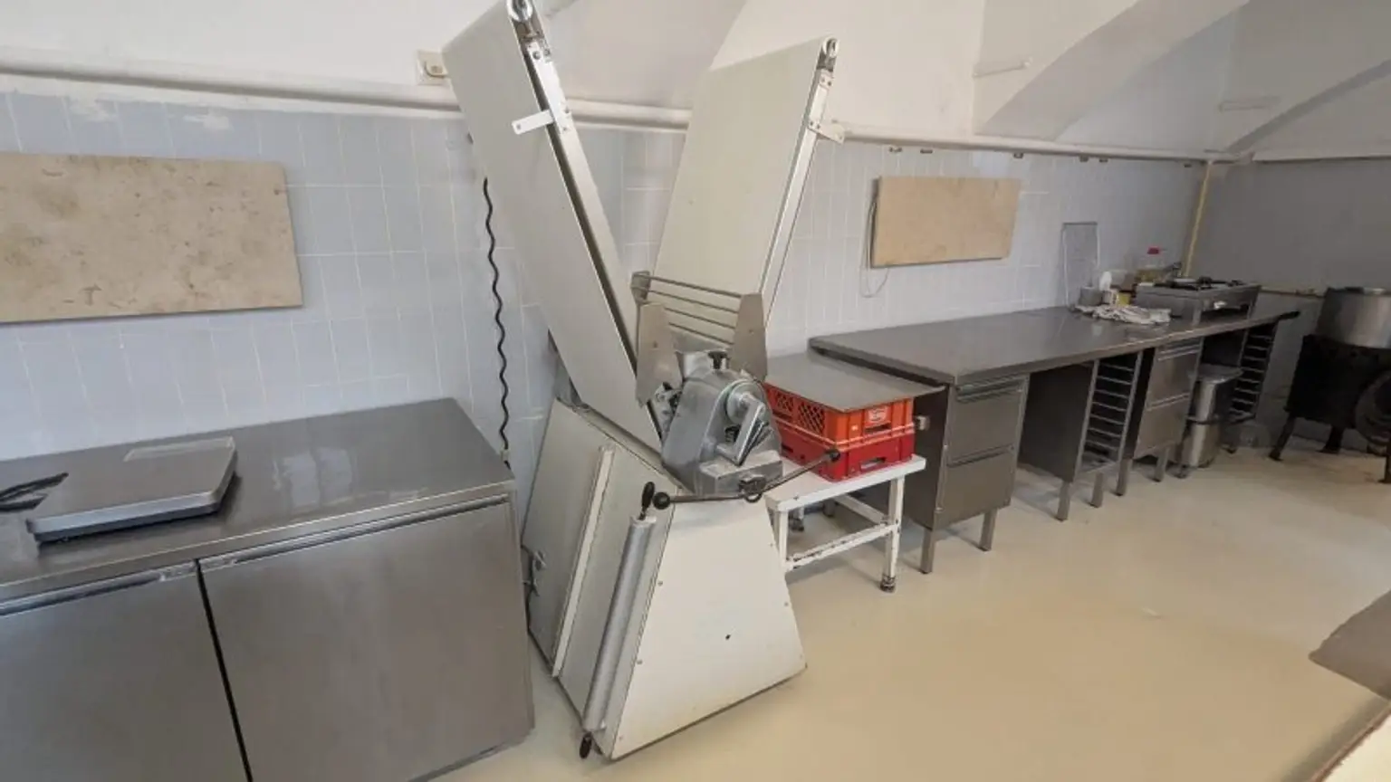 Schockfroster (IVEX), Teigausrollmaschine, 2 Rührmaschinen & Teigknetmaschine (Hahn), 4 Tiefkühltruhen, mehrere Nirosta-Arbeitstische sowie diverses Zubehör.