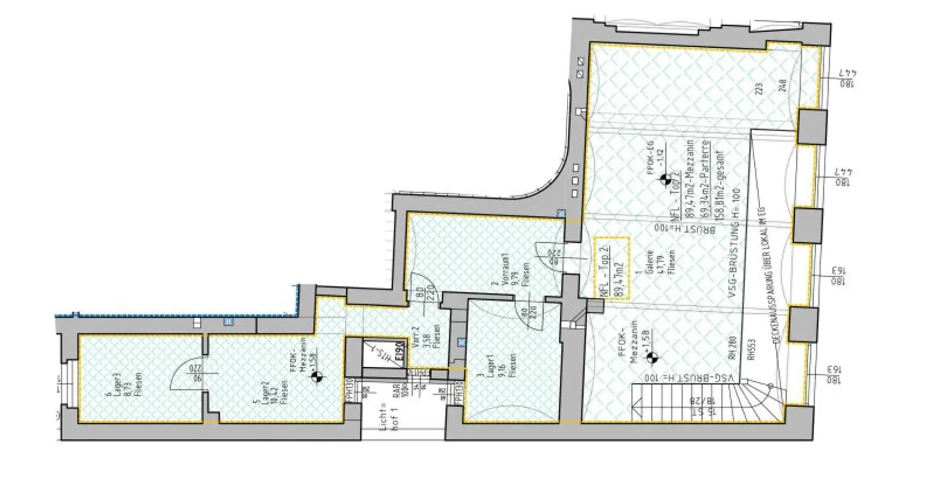 Das Erdgeschoss dieses lukrativen Lokals umfängt eine Fläche von ca. 69,34 m²; der Eingang befindet sich mittig zwischen zwei Schaufenstern. Sie betreten zu aller erst einen großen Raum mit ca. 43 m², in dem links die Treppe ins Obergeschoss hochführt und darunter mittels einer Trennwand ein kleiner Abstellraum entsteht. Gegenüber des großen Raumes befinden sich zwei verflieste Räume mit jeweils ca. 10,31 und 3,16 m². Hier im Erdgeschoss stehen Ihnen und Ihren Kunden eine Toilette mit Vorraum zur Verfügung. Einmal im Obergeschoss angekommen, welches insgesamt 89,47 m² misst, befinden Sie Sich in einer Art großzügigen Galerie mit einer Gesamtnutzfläche von mit ca. 48 m² und vier Fenster, die diesen Raum viel Licht spenden. Von hier gelangen Sie in fünf verflieste Räume, welche teils als Vorraum sowie als Lagerräume oder Behandlungsräume konzipiert sind.