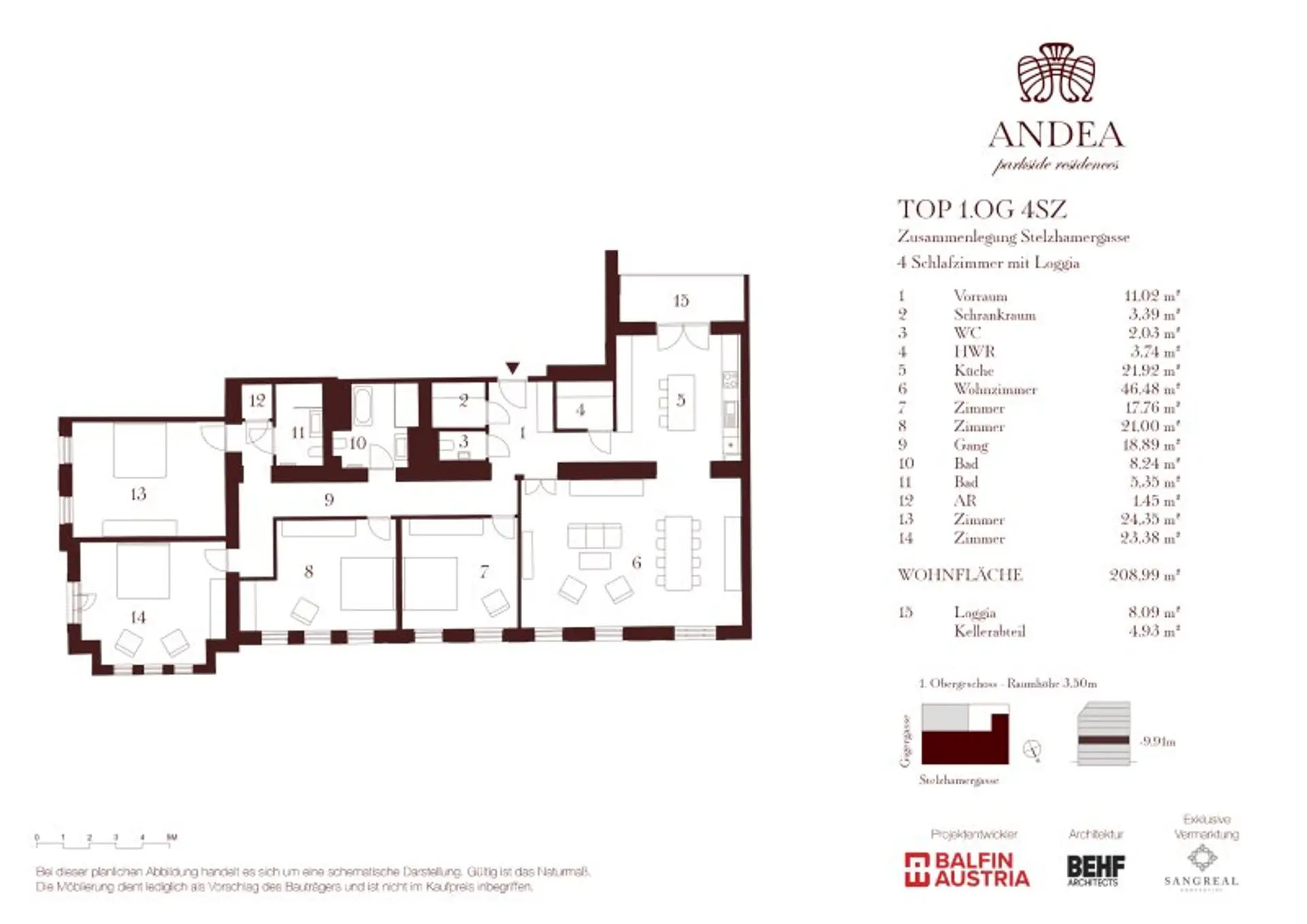 Betreten Sie diese außergewöhnlich großzügige Vier-Schlafzimmer-Wohnung mit Loggia, die sich über rund 209 m² Wohnfläche erstreckt und mit einer beeindruckenden Raumhöhe von ca. 3,50 Metern ein besonders elegantes Wohngefühl vermittelt. Diese exklusive Wohnung im 1. Obergeschoss des Projekts ANDEA – Parkside Residencesverbindet klassische Wiener Architektur mit modernem Wohnkomfort und hochwertiger Ausstattung. Ein Zuhause für anspruchsvolle Bewohnerinnen und Bewohner, die Großzügigkeit, Stil und urbanen Lebensraum schätzen.