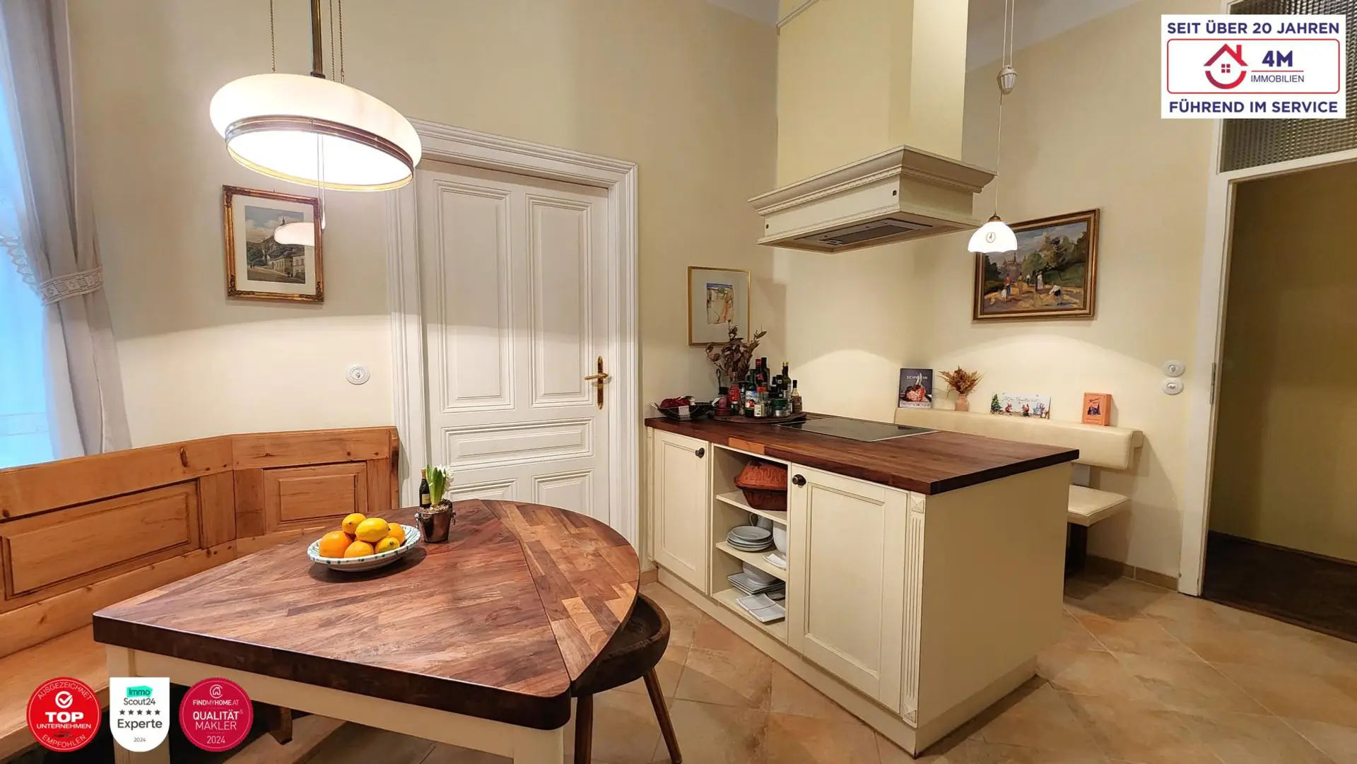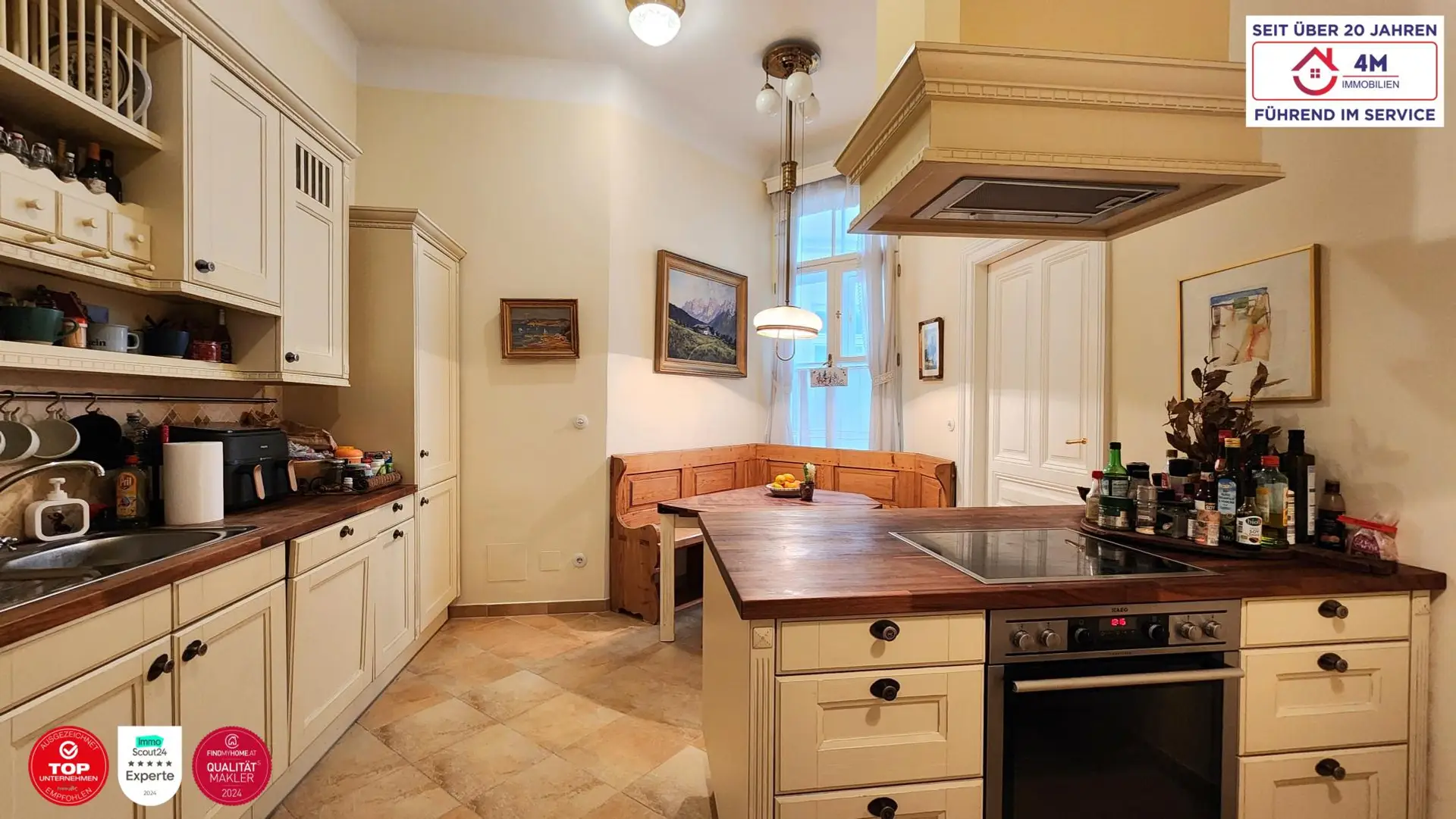 Die separate Küche mit Essplatz unterstreicht den klassischen Grundrisscharakter. Badezimmer mit Wanne und Dusche, separates WC sowie ein kleiner hofseitiger Balkon ergänzen das Raumangebot.