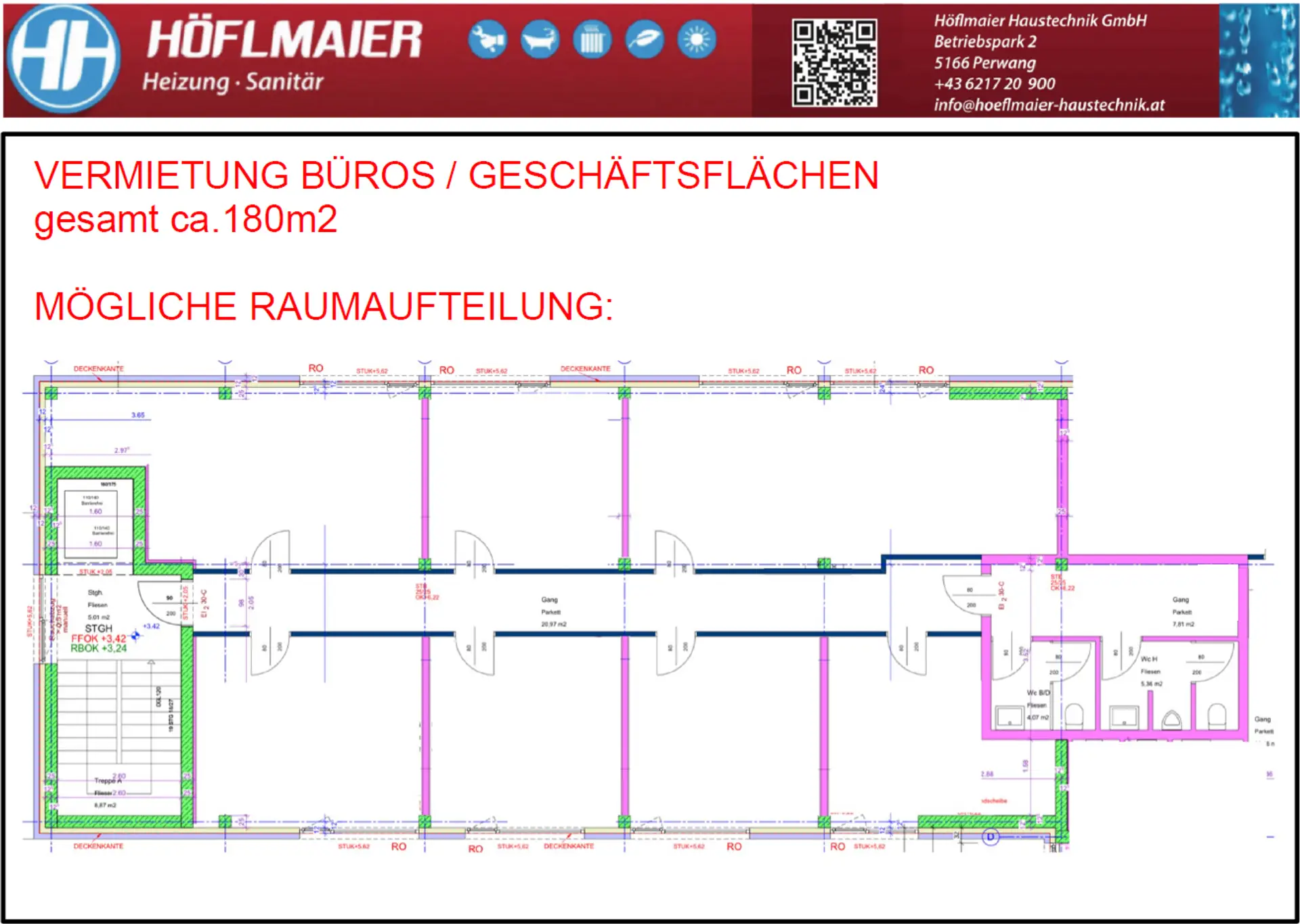 Diese moderne und flexibel nutzbare Geschäftsfläche mit rund 180 m² Nutzfläche (teilbar) bietet ideale Voraussetzungen für Ihr neues Büro, Ihre Kanzlei, Ihr Geschäftslokal, ein Restaurant, einen Schauraum, eine Praxis oder ein Kosmetikstudio.