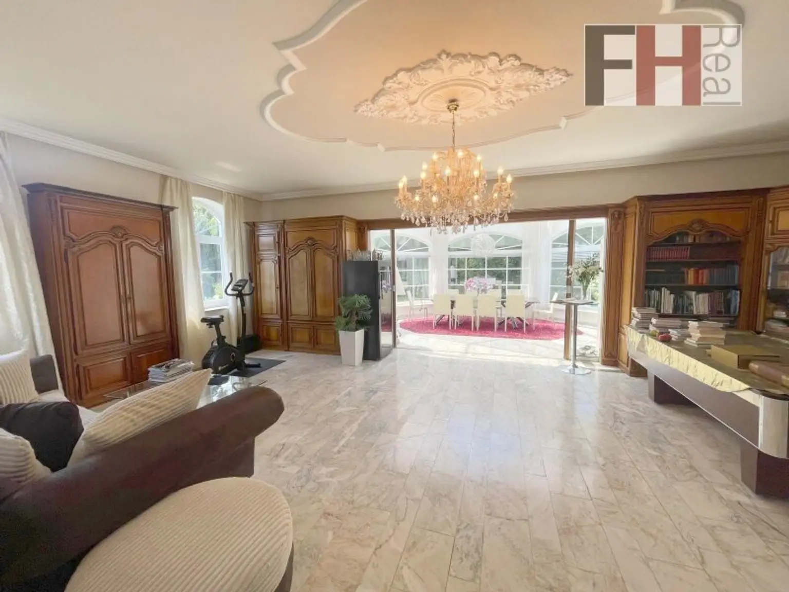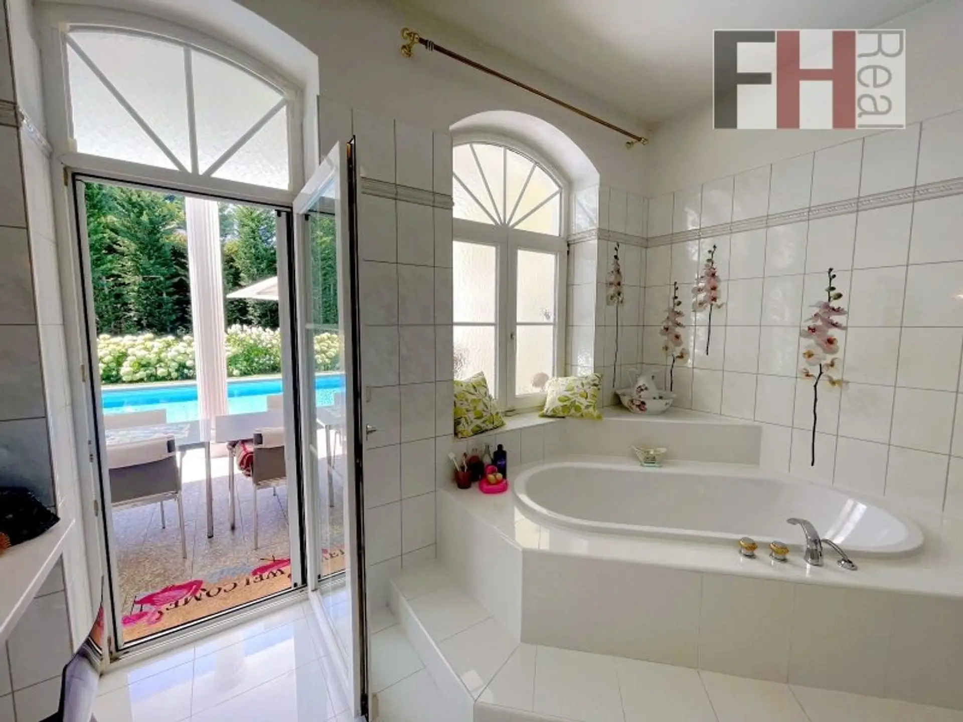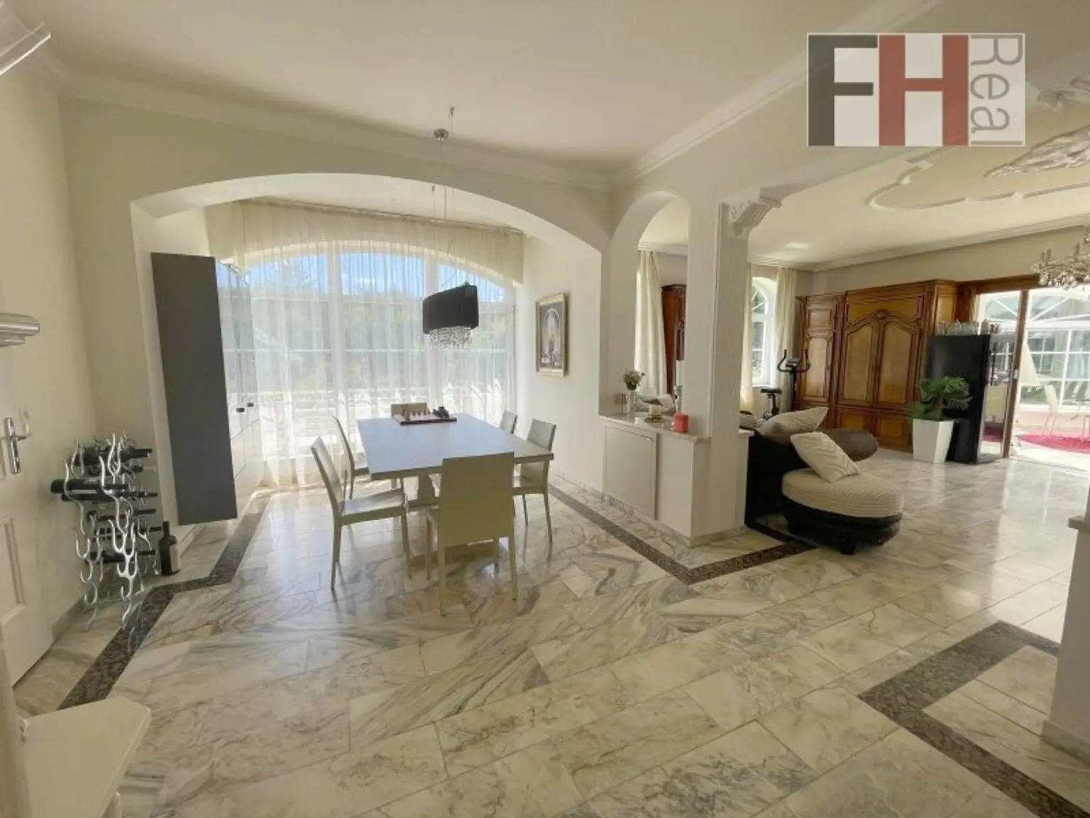 Sie betreten die Villa ebenerdig durch eine elegante, solide Sicherheitstür und befinden sich gleich im Vorraum mit Blick in das mehr als 20m² große Entree mit lichtdurchflutendem exklusiven Stiegenaufgang, jener durch wenige Stiegen zum Livingroom führt. Selbstverständlich können Sie auch über die großzügige Doppelgarage in die Diele kommen. In weiterer Folge kommt man durch eine doppelflügelige Glastüre zum absoluten Highlight der Liegenschaft, in den ca.43m² großen offenen Wohnsalon, einem eleganten Speiseraum mit weißem Kachelofen, einem Kaminzimmer mit Büro und einer voll- und bestens ausgestatteten Küche mit Markengeräten inkl. einer gemütlichen Frühstücksecke. Etwas separiert aber mit offenem Durchgang, befinden sich auf dieser Ebene auch die weiteren Zimmer wie Schlafzimmer, Bekleidungsraum, eventuelles Kinderzimmer und ein großzügiges Bad mit Regendusche, Badewanne etc. ebenso mit einem direkten Zugang zur Terrasse und in weiterer Folge zum Pool. Komplettiert wird diese Etage noch mit einem weiteren Zimmer und einer seperaten Toilette.