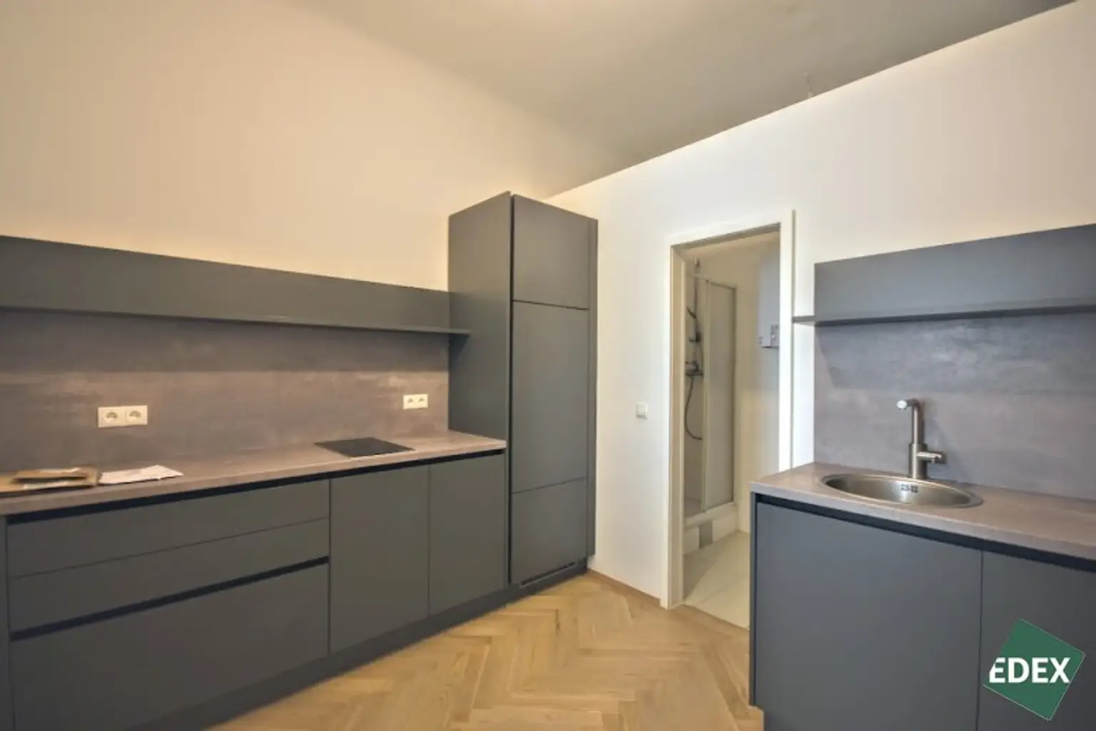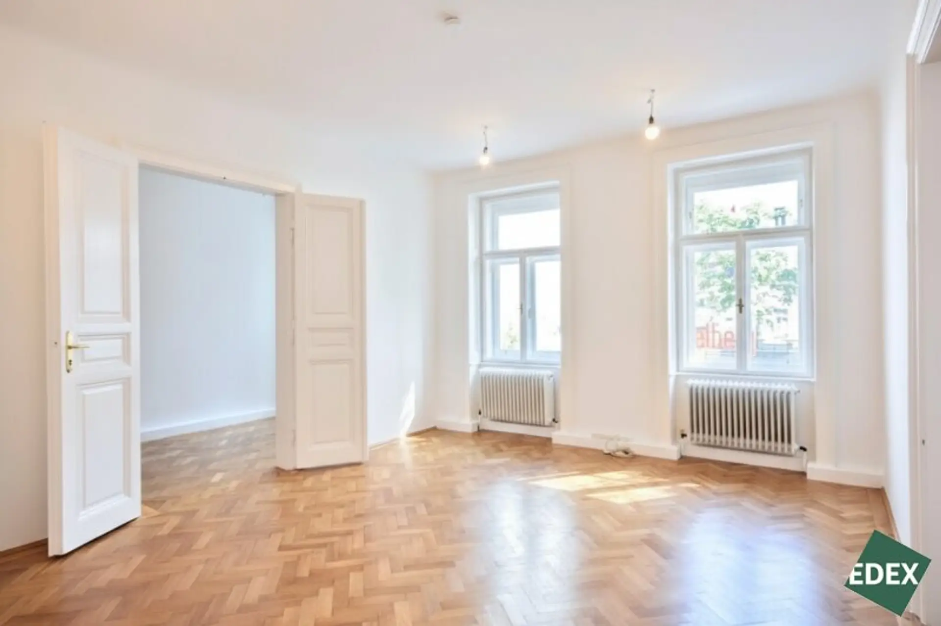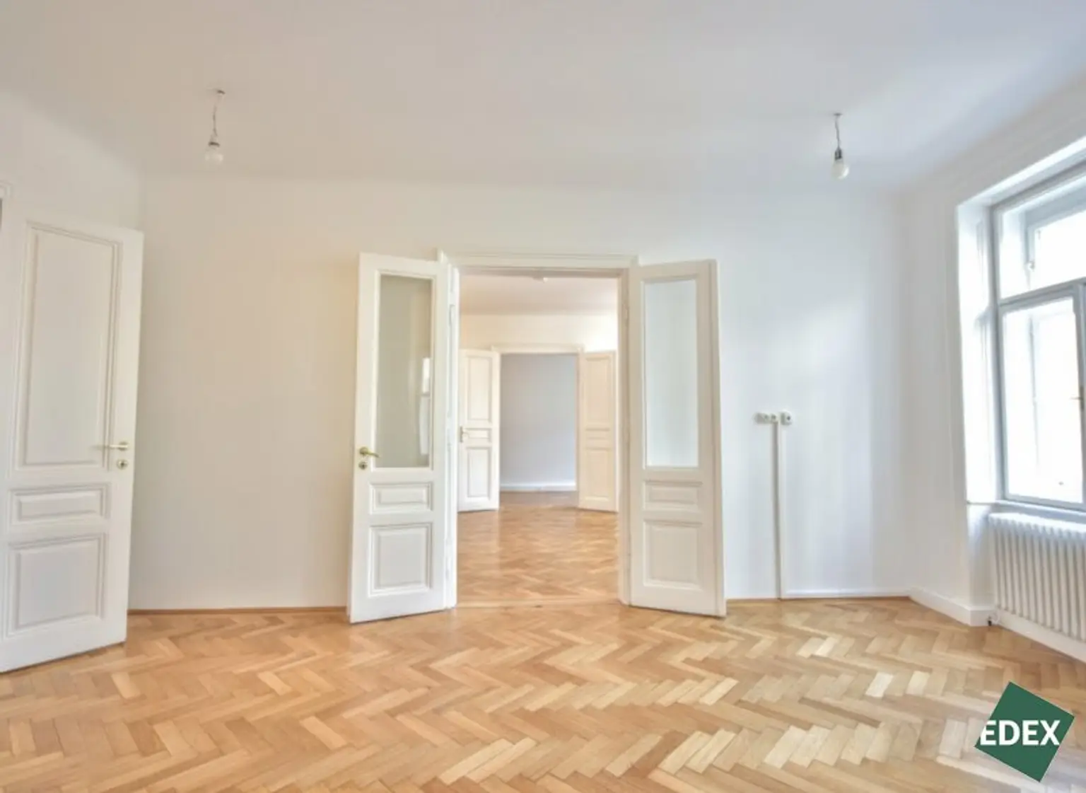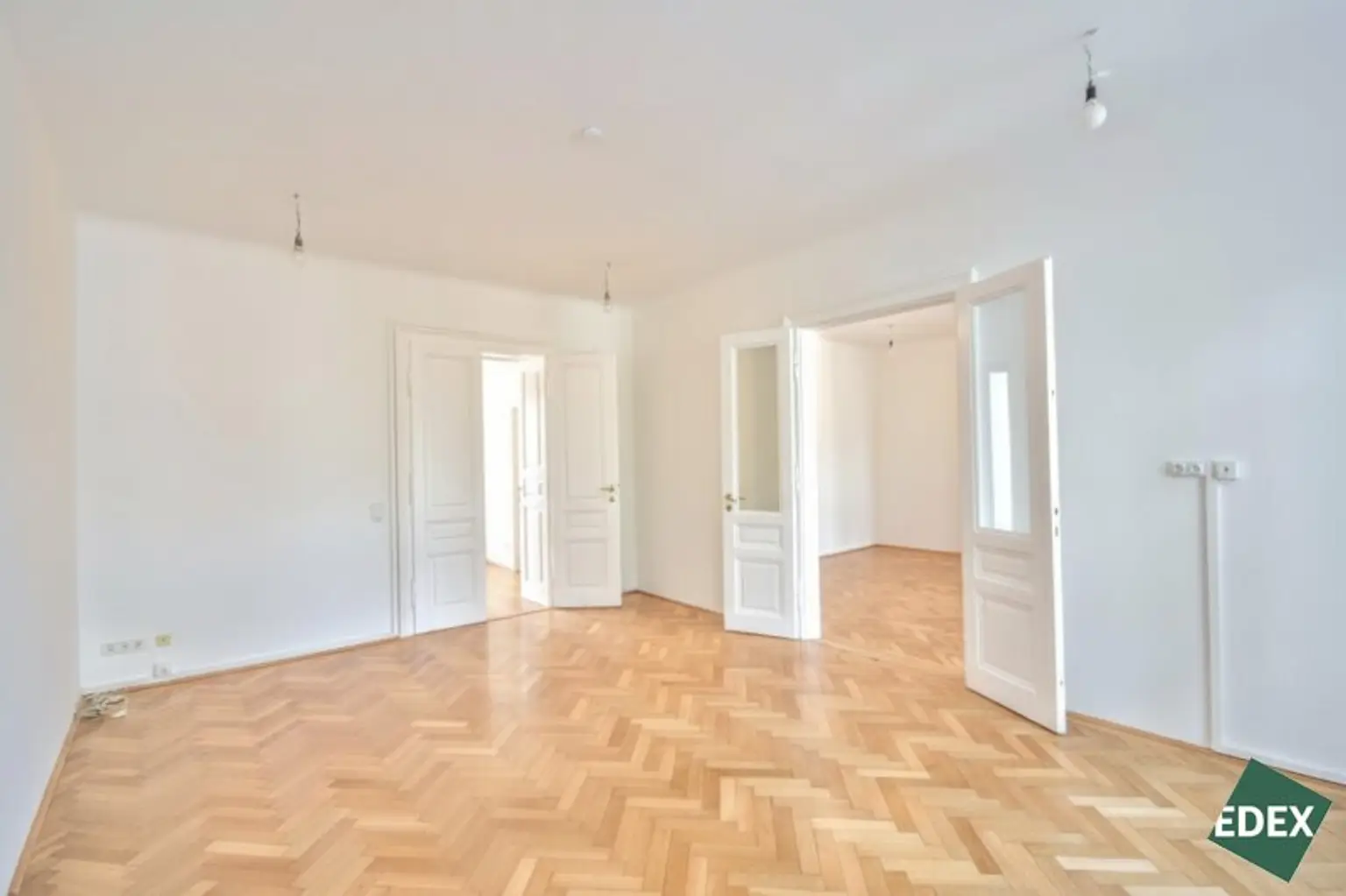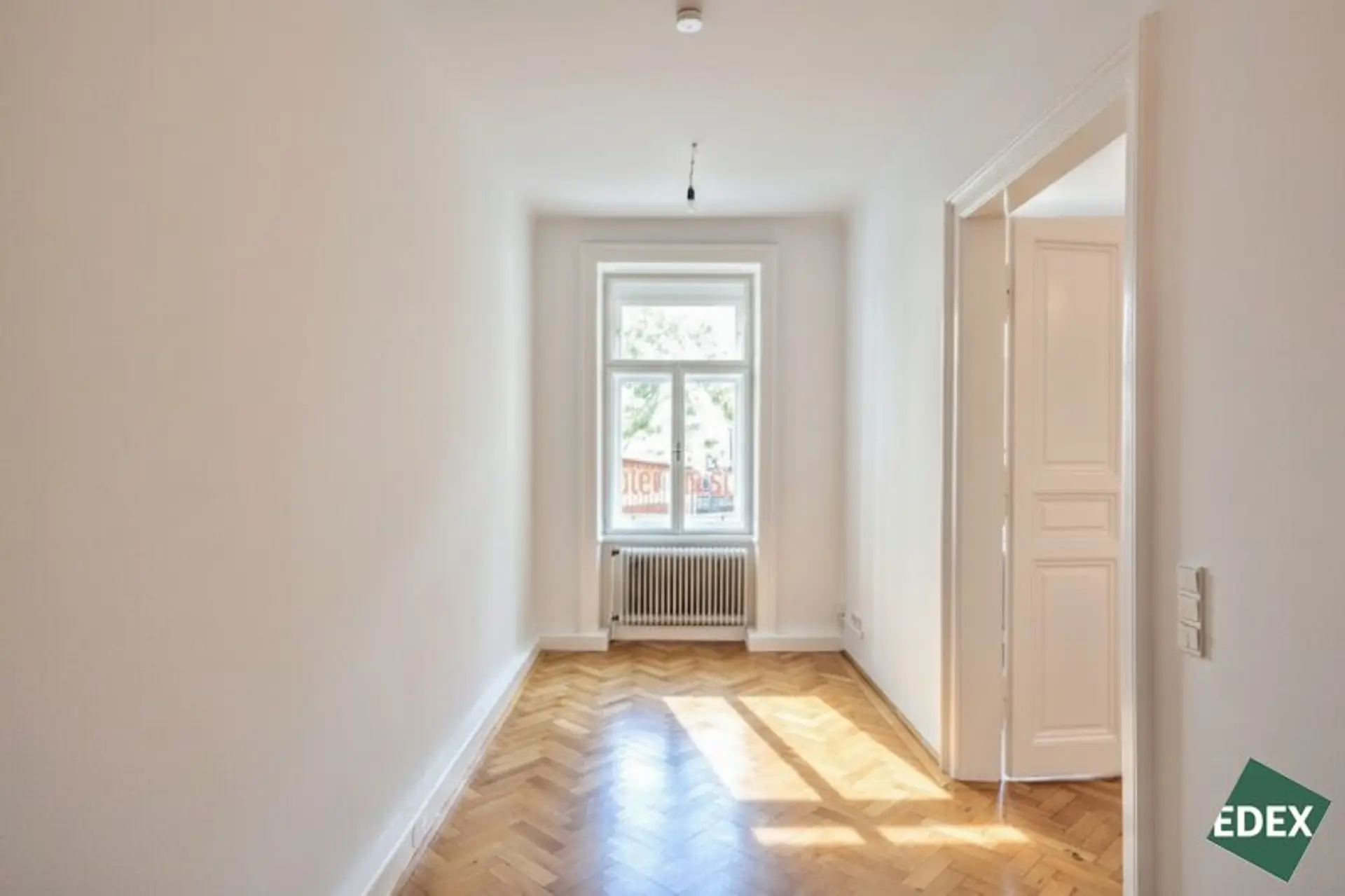 Die straßenseitig zur Spittelberggasse ausgerichteten Büroräume überzeugen durch klassische Altbauelemente wie Flügeltüren und Fischgrätparkett und schaffen eine angenehme Arbeitsatmosphäre mit besonderem Charakter.