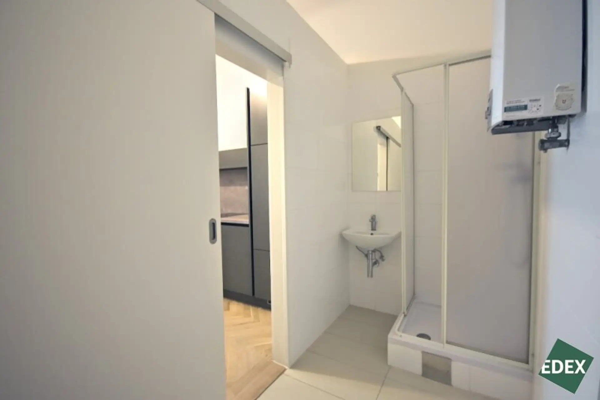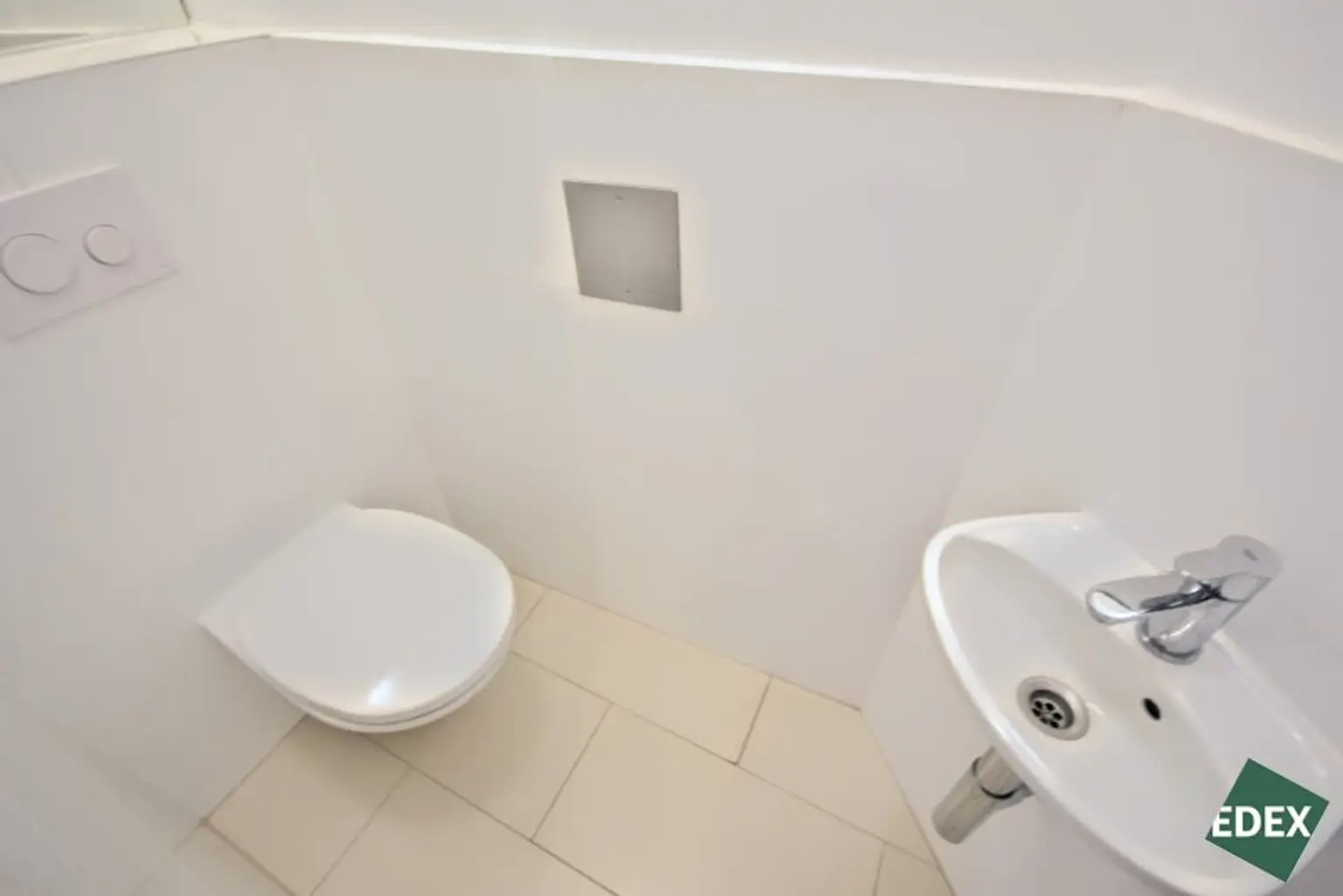 Im hinteren Bereich befindet sich ein weiterer Raum, der sich optimal als Archiv oder Lager nutzen lässt, ebenso wie das zweite WC. Die Küche ist funktional angelegt und bietet zudem Zugang zu einem kleinen Badezimmer mit Dusche.