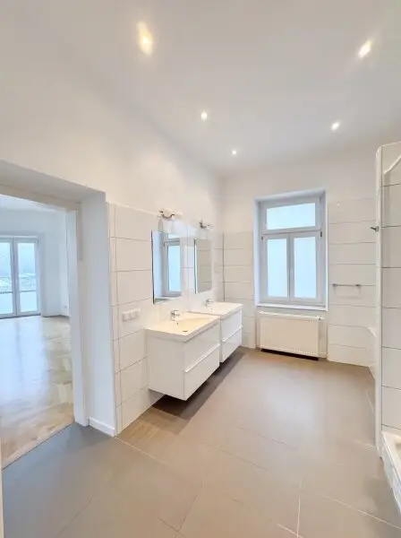 * Badezimmer: 12,98 m² – mit Dusche, Doppelwaschbecken und Fenster
