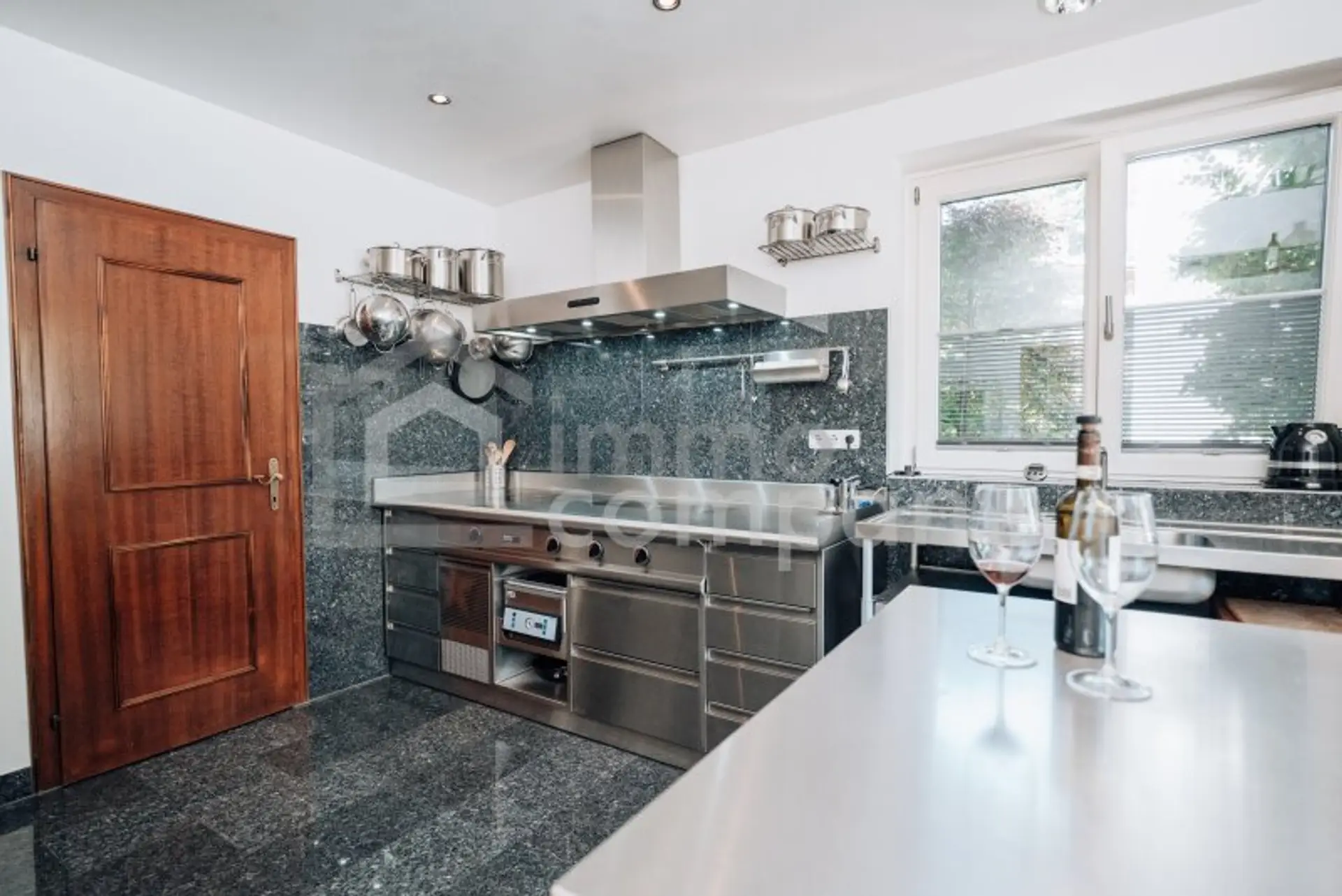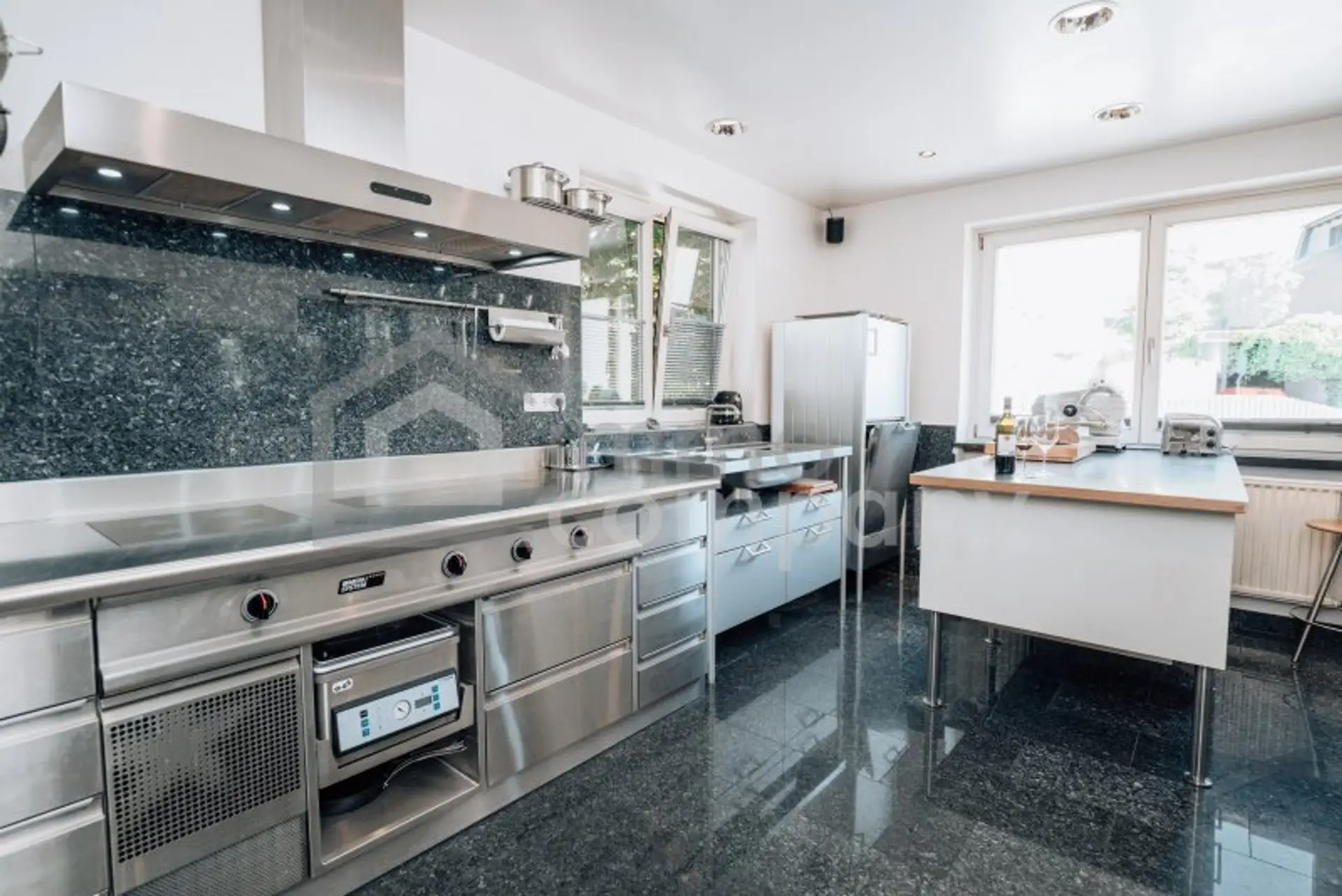 * Küchen: Profi Herd von Menue System; Großraumbackofen von Gaggenau; Brotbackofen von NFG; Arbeitstisch mit Edelstahlplatte von Bulthaup; Gutmann-Dunstabzugshaube mit außenliegendem Motor