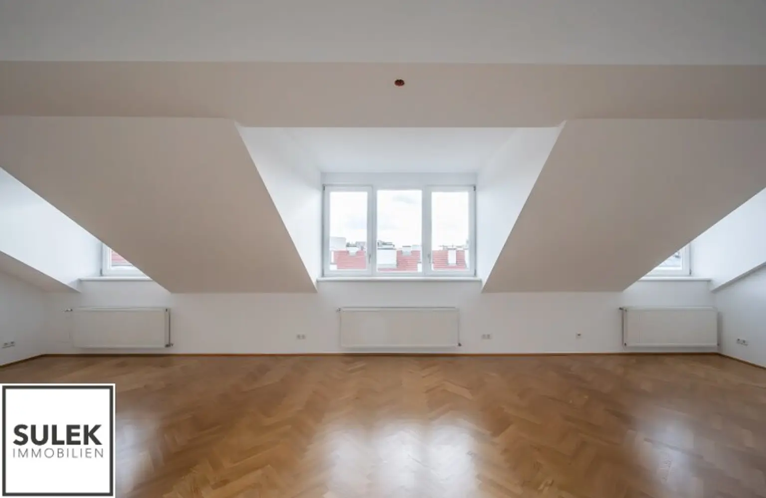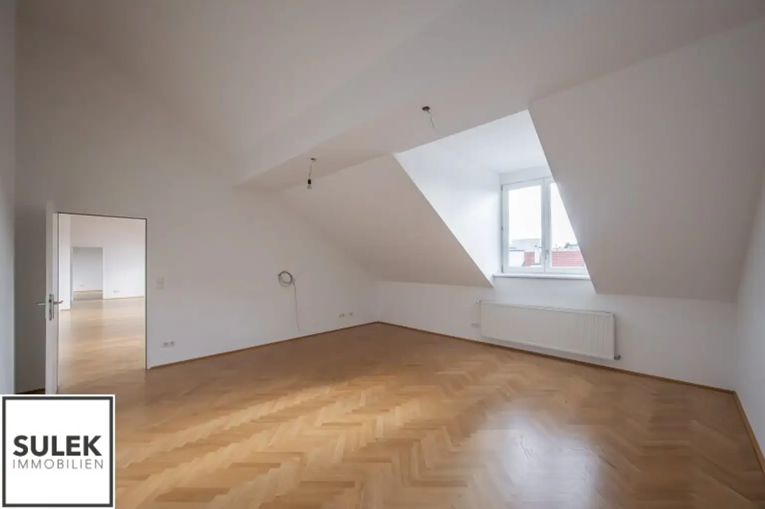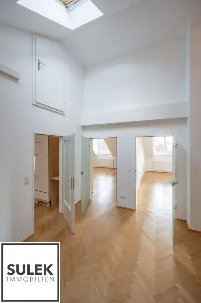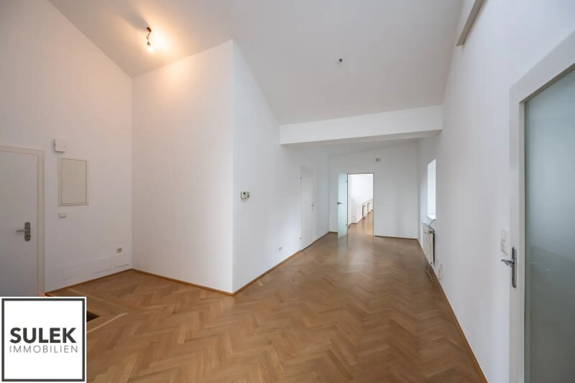 Das Büro versprüht eine exklusive Arbeitsatmosphäre. Edles Fischgrätparkett zieht sich durch die Räume, während zahlreiche, große Dachflächenfenster für maximales Tageslicht sorgen. Die Büroeinheit wurde kürzlich frisch weiß ausgemalt.