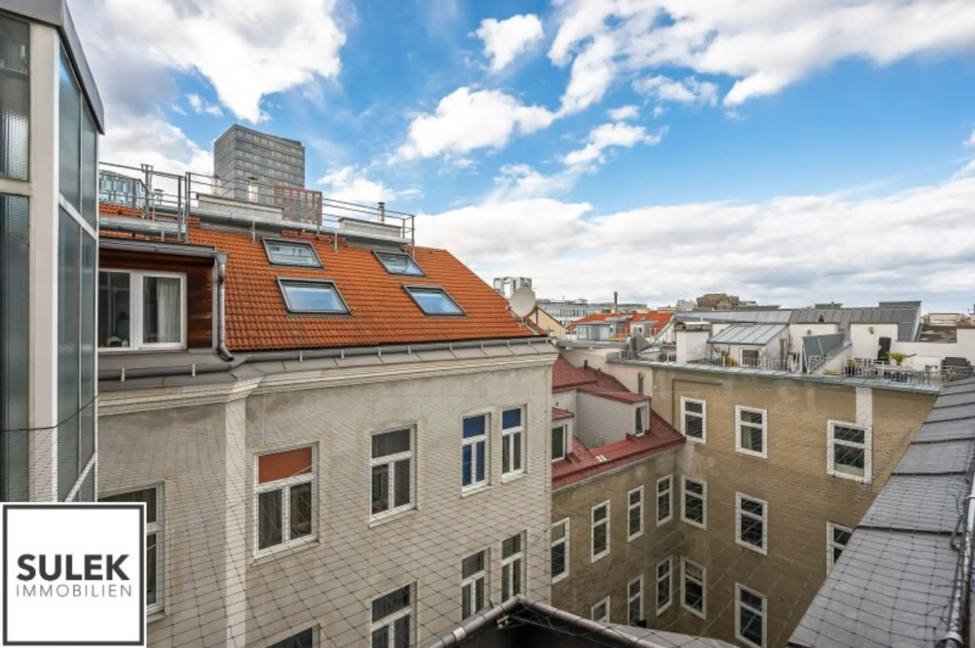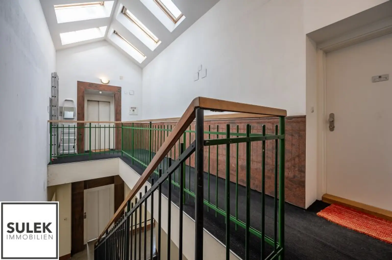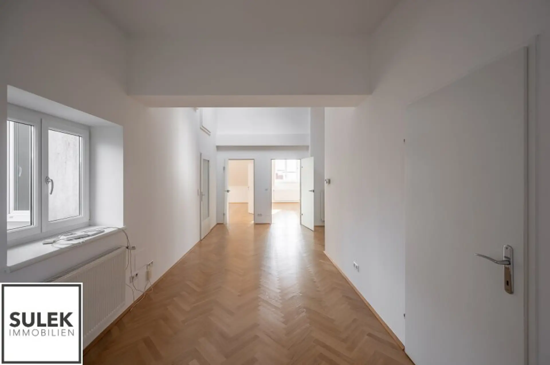 Das Büro versprüht eine exklusive Arbeitsatmosphäre. Edles Fischgrätparkett zieht sich durch die Räume, während zahlreiche, große Dachflächenfenster für maximales Tageslicht sorgen. Die Büroeinheit wurde kürzlich frisch weiß ausgemalt.