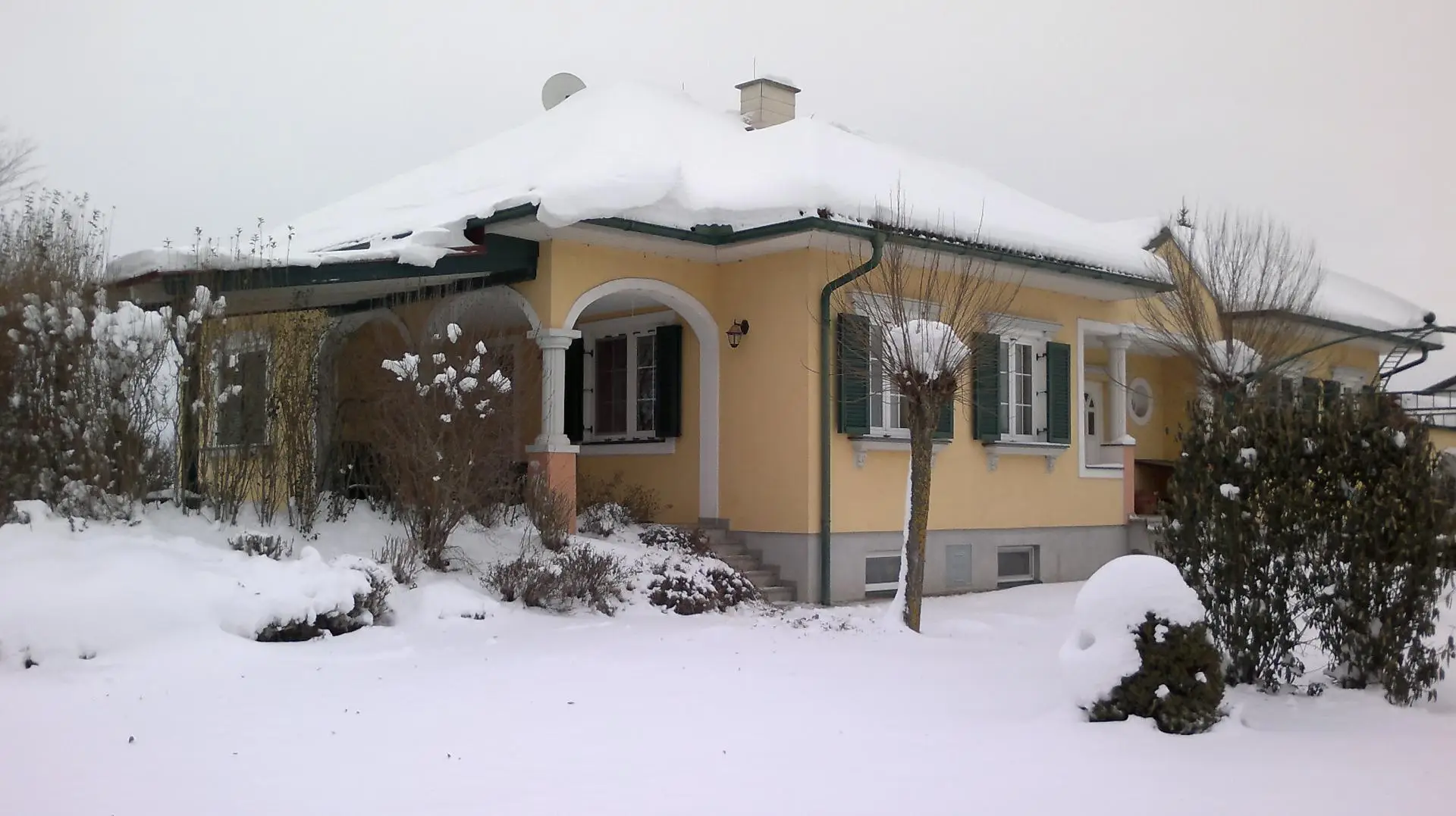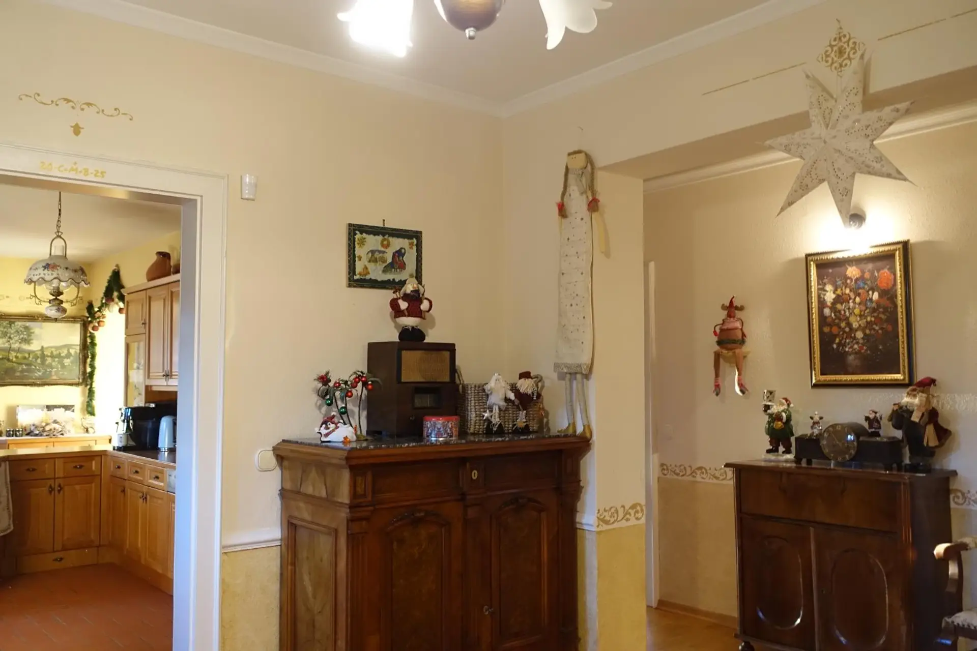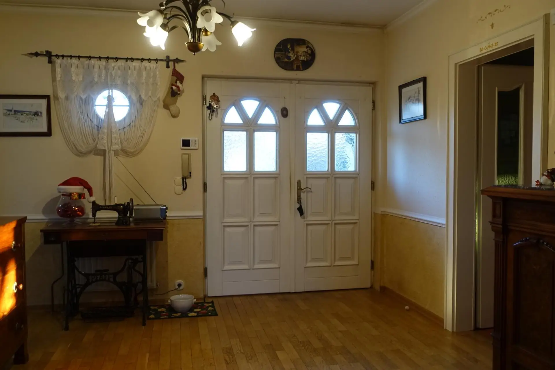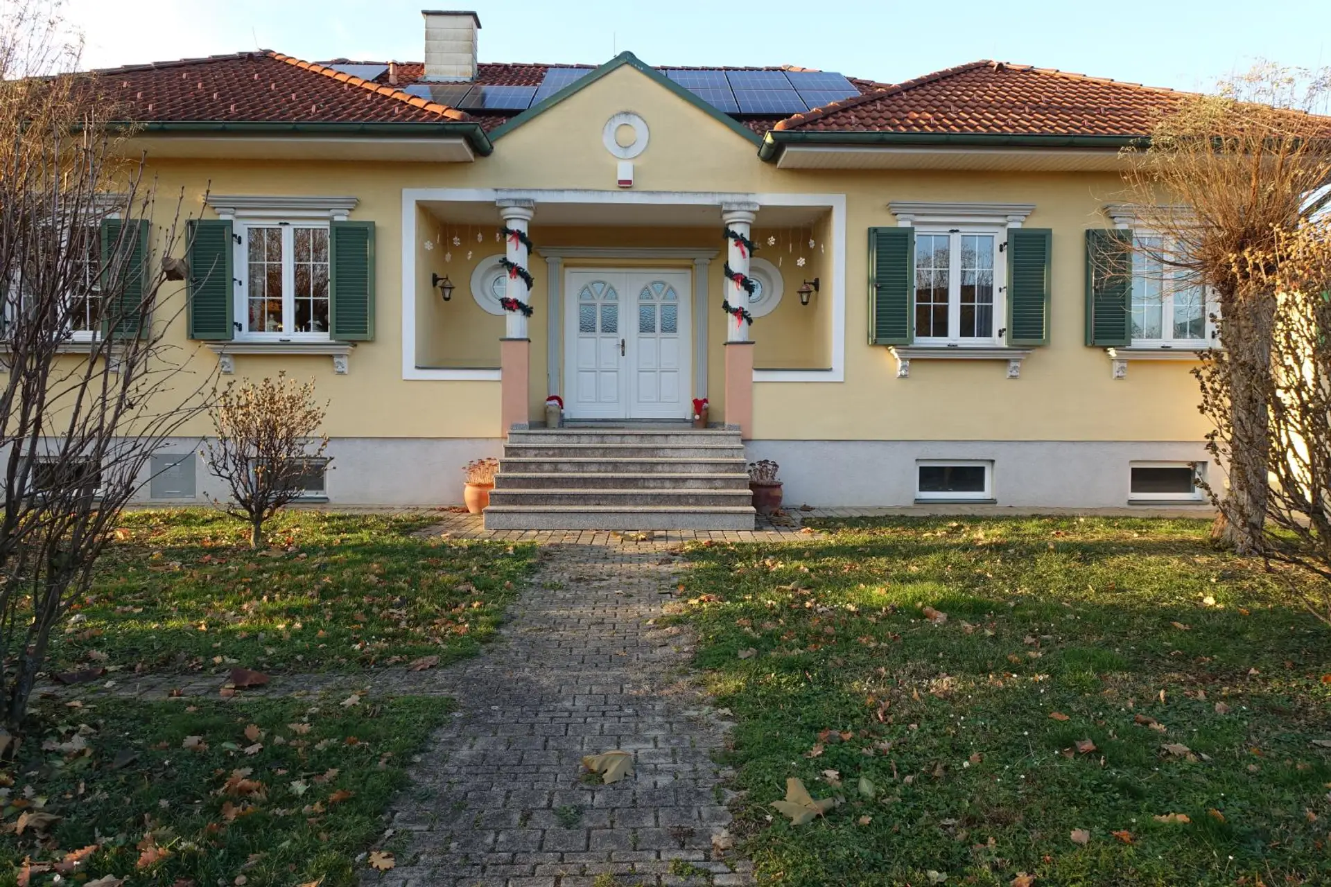 Über den einladenden Außenbereich, der mit Säulen geschmückt ist, gelangt man durch eine Doppeltür in das Haus. Vom großzügigen Vorraum erreicht man das derzeitige Büro, den Wohnbereich, alle weiteren Räume sowie das Kellergeschoss, den Dachboden und die anschließende Garage.