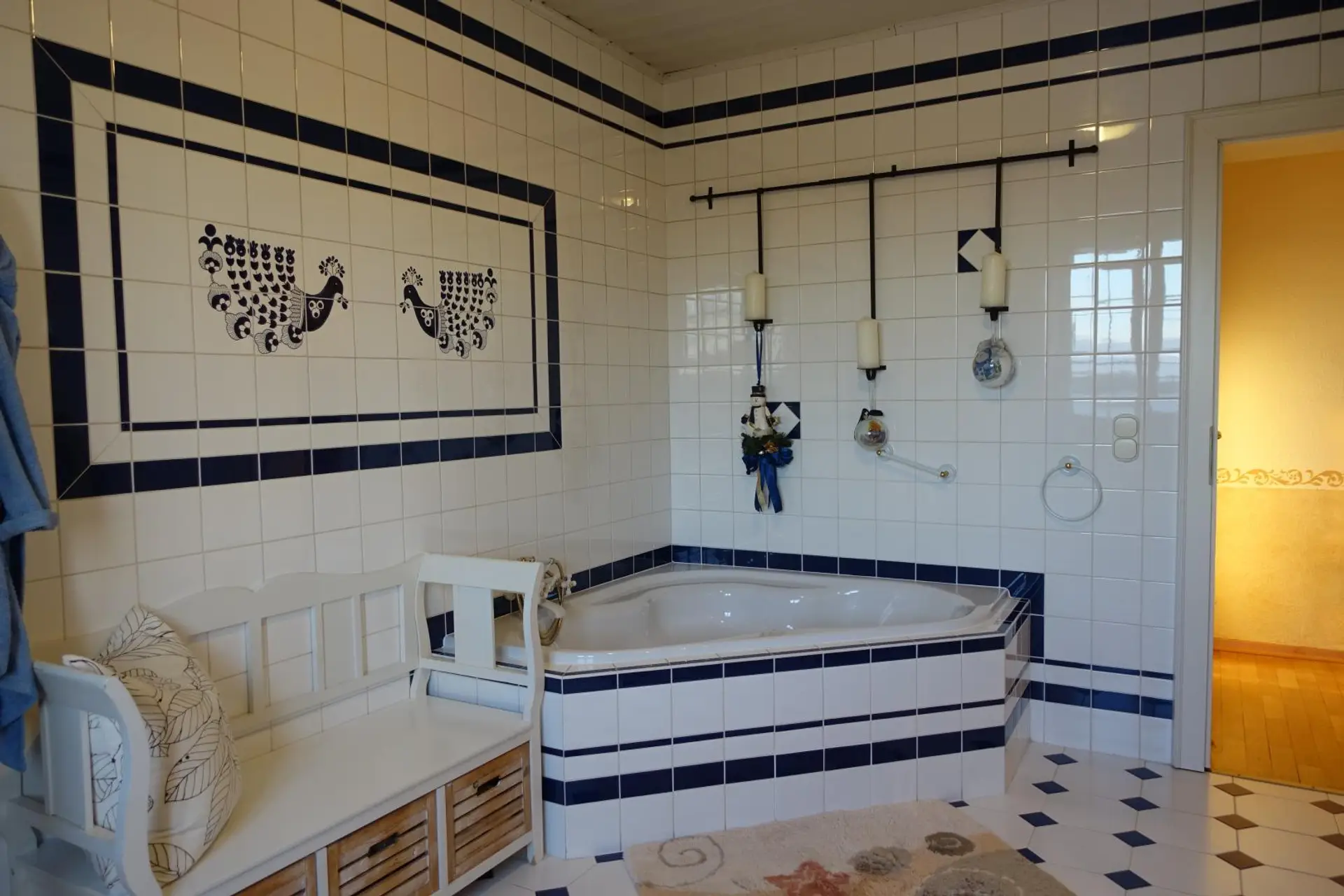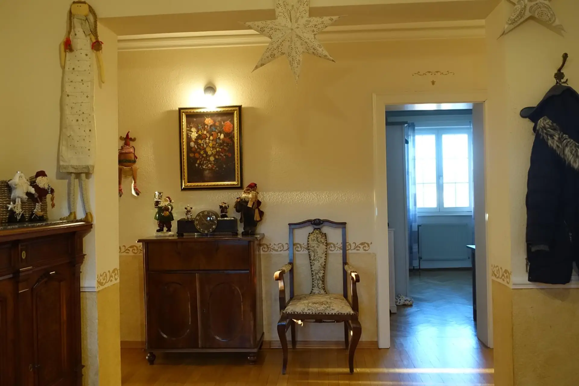 Die Räume erstrahlen durch hochwertigen Gipsstuck an Decken und Wänden, Echtholzparkett, edle Fliesen und Marmor.