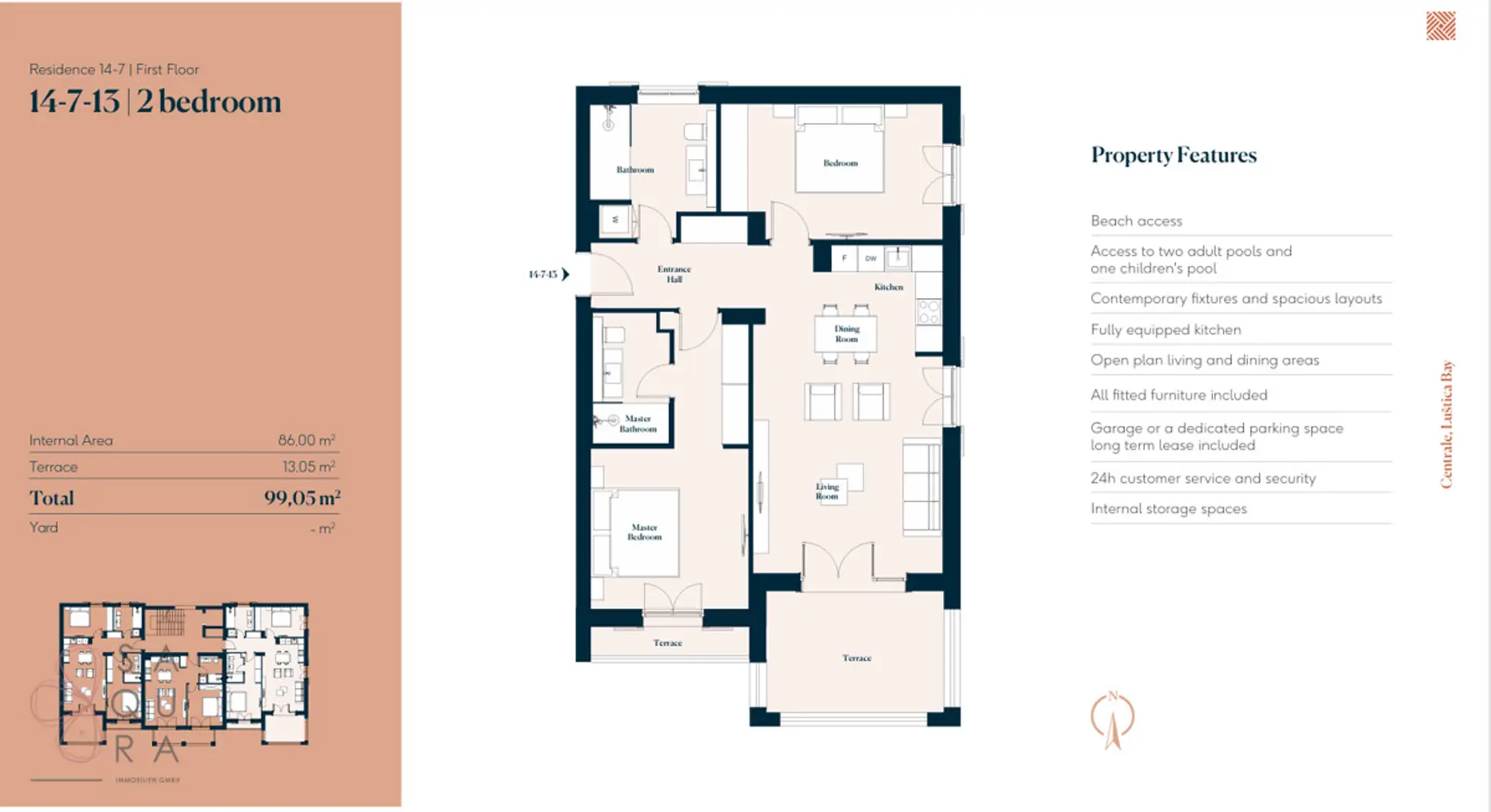 The port of Lustica Bay offers top-tier facilities for sailors and yacht owners, making it one of the most attractive destinations in the Adriatic. With 115 berths for yachts up to 45 meters, access to four international airports, and luxurious amenities such as restaurants, boutiques, and a 5-star hotel, Lustica Bay provides everything you need for an unforgettable yachting experience. Built sustainably and integrated into the natural surroundings, the marina will feature a total of 176 berths upon completion. Additional services include caretaker service, power supply, WiFi, and more premium amenities.