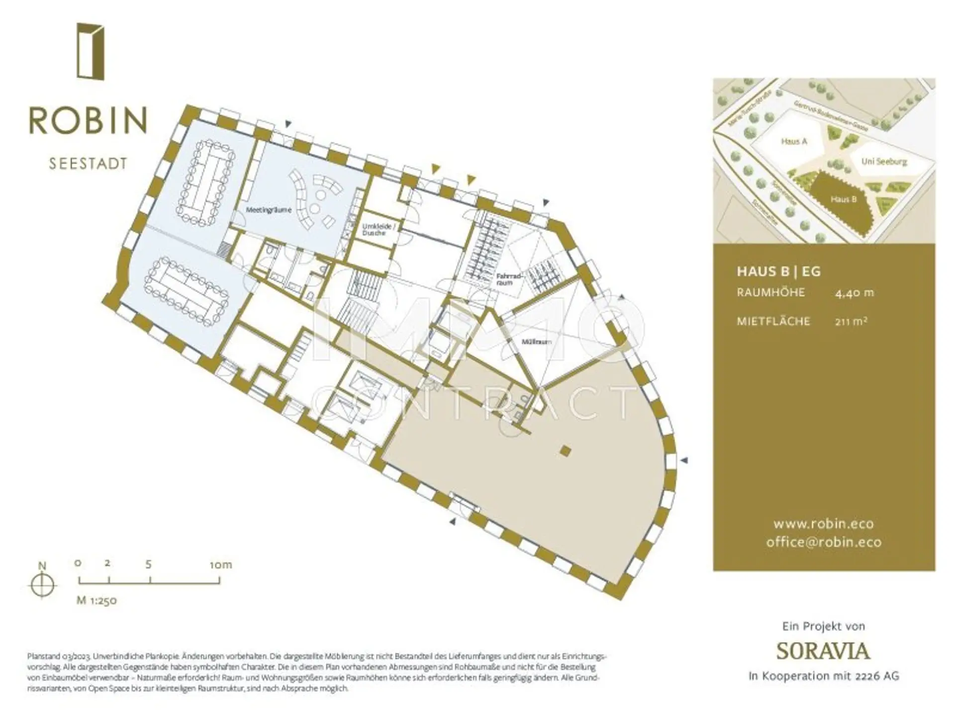 Direkt in der Fußgängerzone am Eva-Maria-Mazzucco-Platz liegt ROBIN Seestadt mit der Adresse Sonnenalle 28-30 in unmittelbarer Seenähe und bieten mit den drei Gebäude beste Voraussetzungen für Workspaces zum Wohlfühlen.