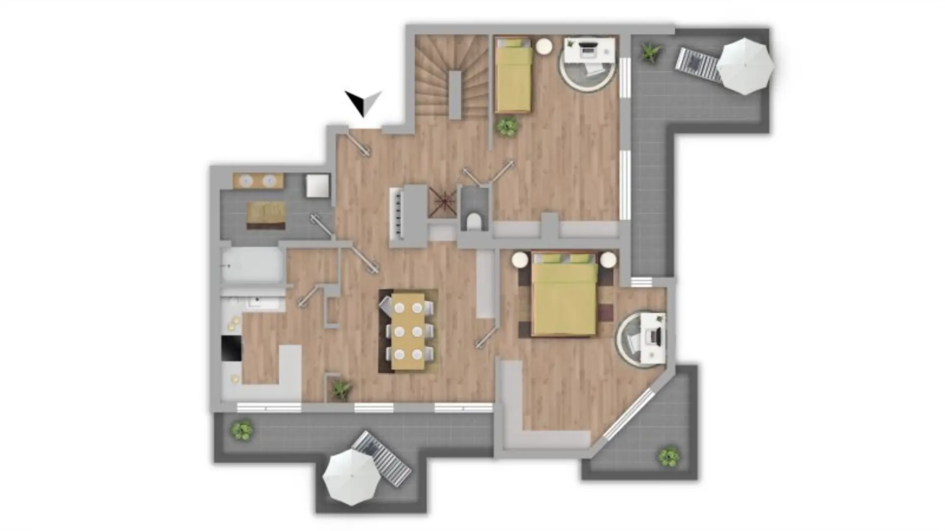 Zwei Schlafzimmer, jeweils mit eigenem Terrassenzugang, bieten Rückzugsorte mit besonderer Qualität – der Blick ins Grüne begleitet hier jeden Tagesbeginn.