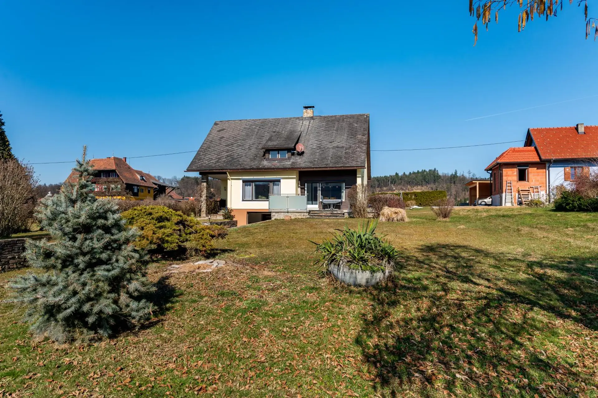 Am ruhigen Ortsrand von Wildon, in angenehmer Lage mit schöner Südausrichtung, befindet sich dieses charmante Einfamilienhaus auf einem großzügigen Grundstück mit 1.284 m² Fläche. Das Haus wurde 1966 errichtet und präsentiert sich trotz seines Alters gepflegt und gut erhalten. Es bietet eine hervorragende Grundlage, um mit Renovierungsarbeiten ein modernes und individuelles Zuhause für eine Familie zu schaffen.