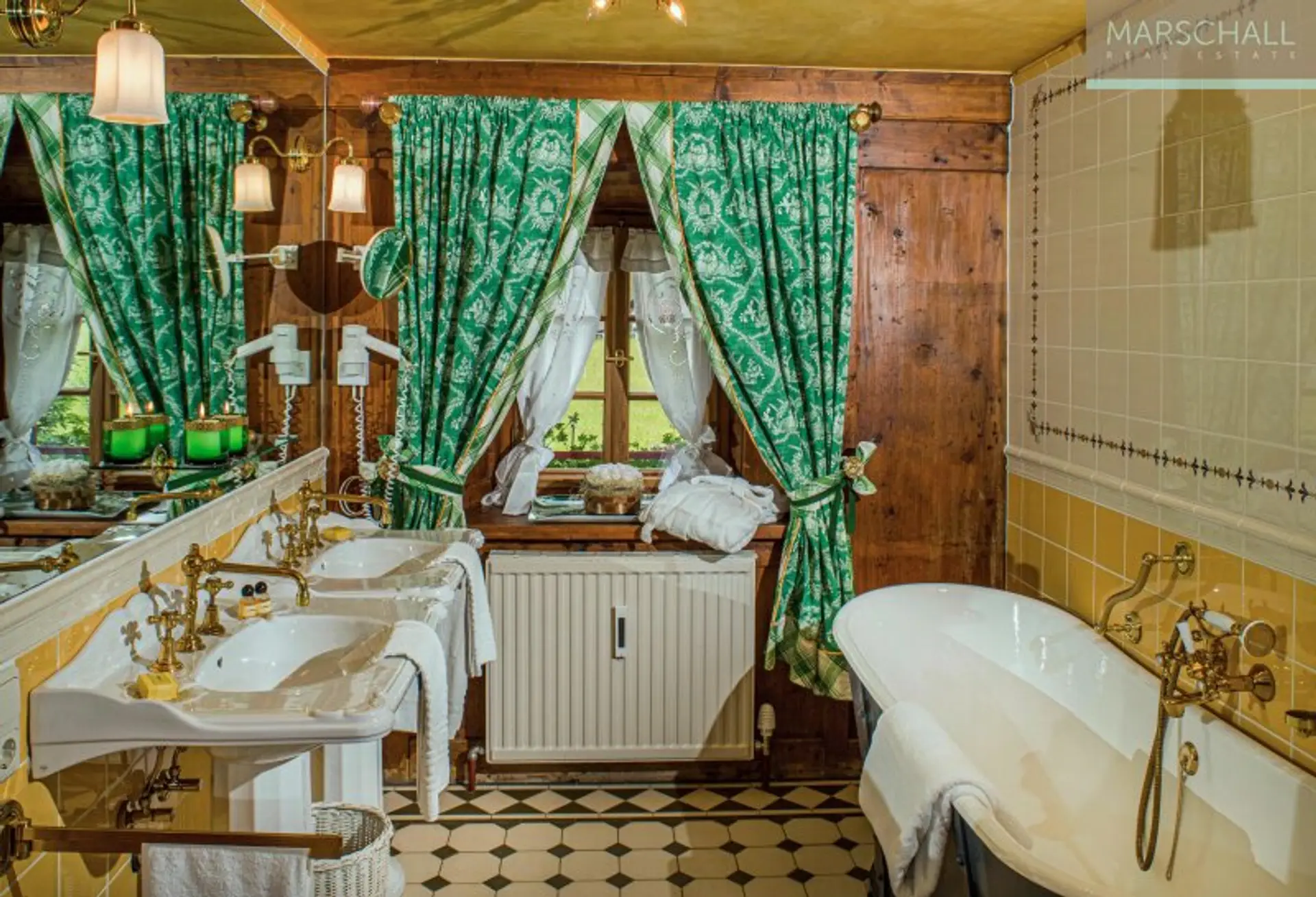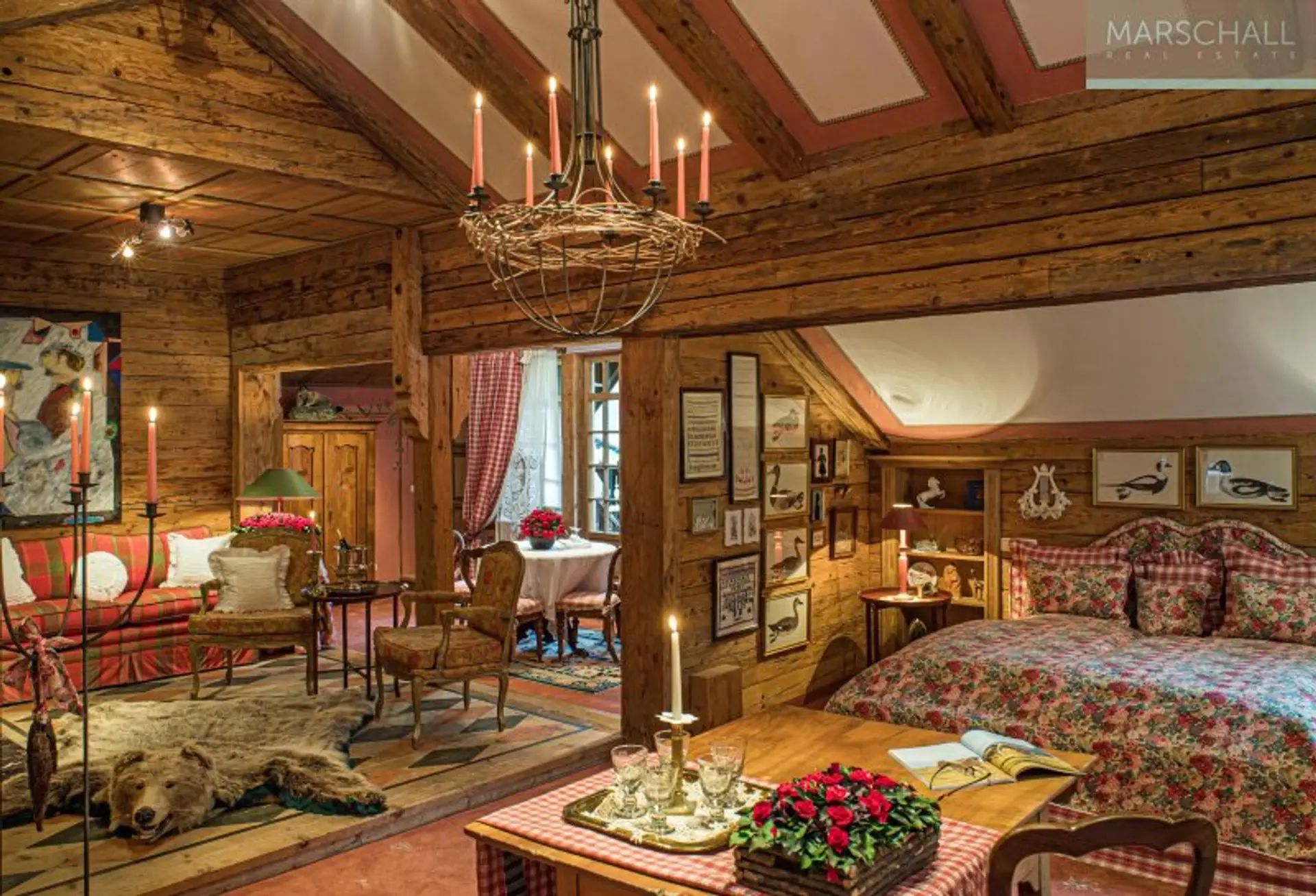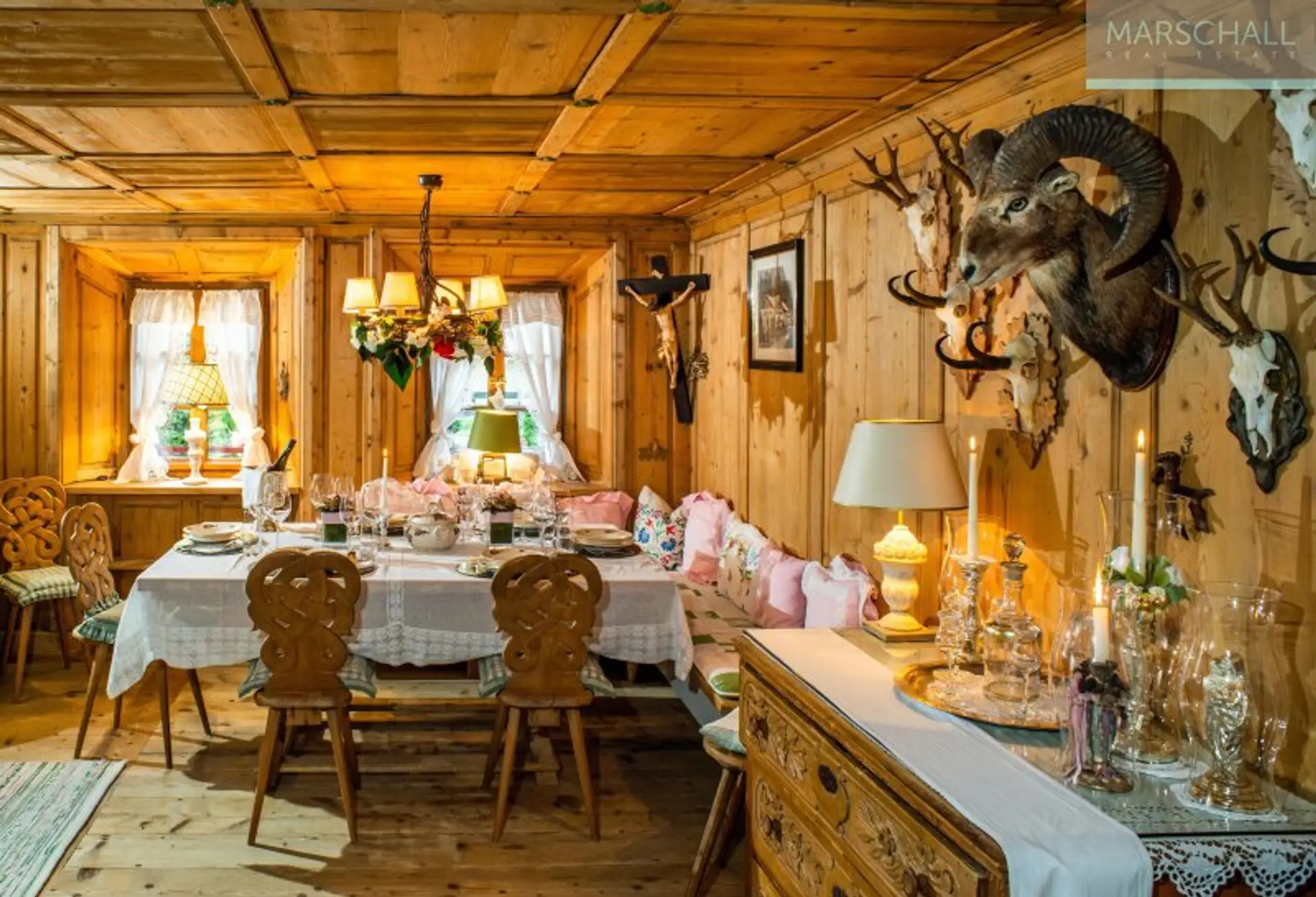 Das Hauptgebäude selbst wirkt durch seine Größe und rustikale Optik wie ein herrschaftliches Jagdschloss mit allen Attributen, wie einem eisernen Einfahrtstor mit einer baumgesäumten Zufahrt, einem Burgturm, mehreren Bachbrücken und klassischen Windläden sowie diversen Jagdtrophäen. Auch die Räumlichkeiten im Inneren sind elegant und charmant, teils opulent und mit viel Liebe zum Detail ausgestattet. Klassisch rustikale Antiquitäten, handgefertigte Holzarbeiten und kostbare Stoffe im Landhausstil stehen für die Tradition des Hauses in seiner Umgebung. Dies macht den besonderen Charme des Anwesens aus. Insgesamt stehen ca. 1.000m² Wohnnutzfläche in insgesamt 20 Zimmern zur Verfügung. Beheizt wird nachhaltig mit Wasserwärmepumpe.