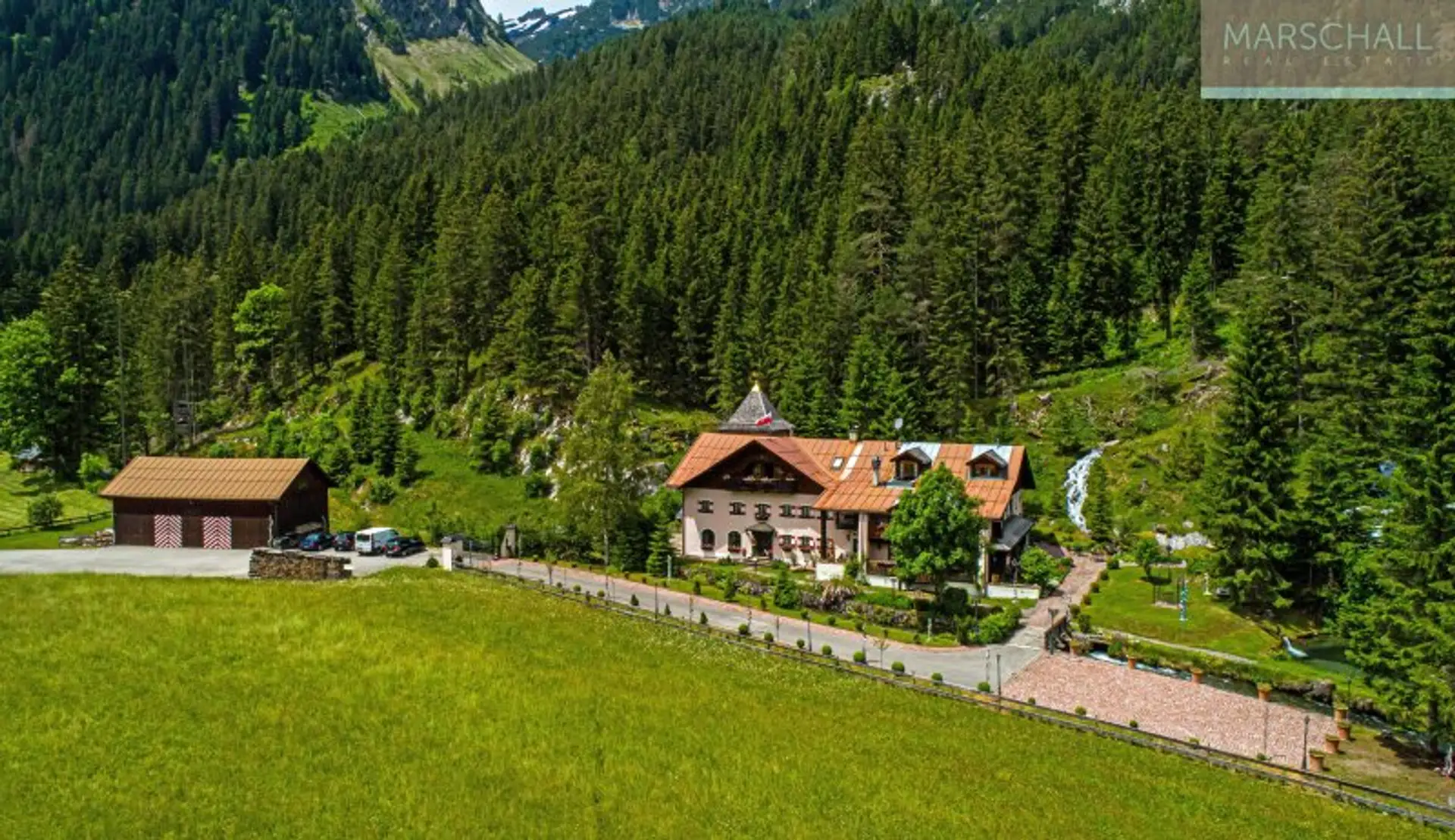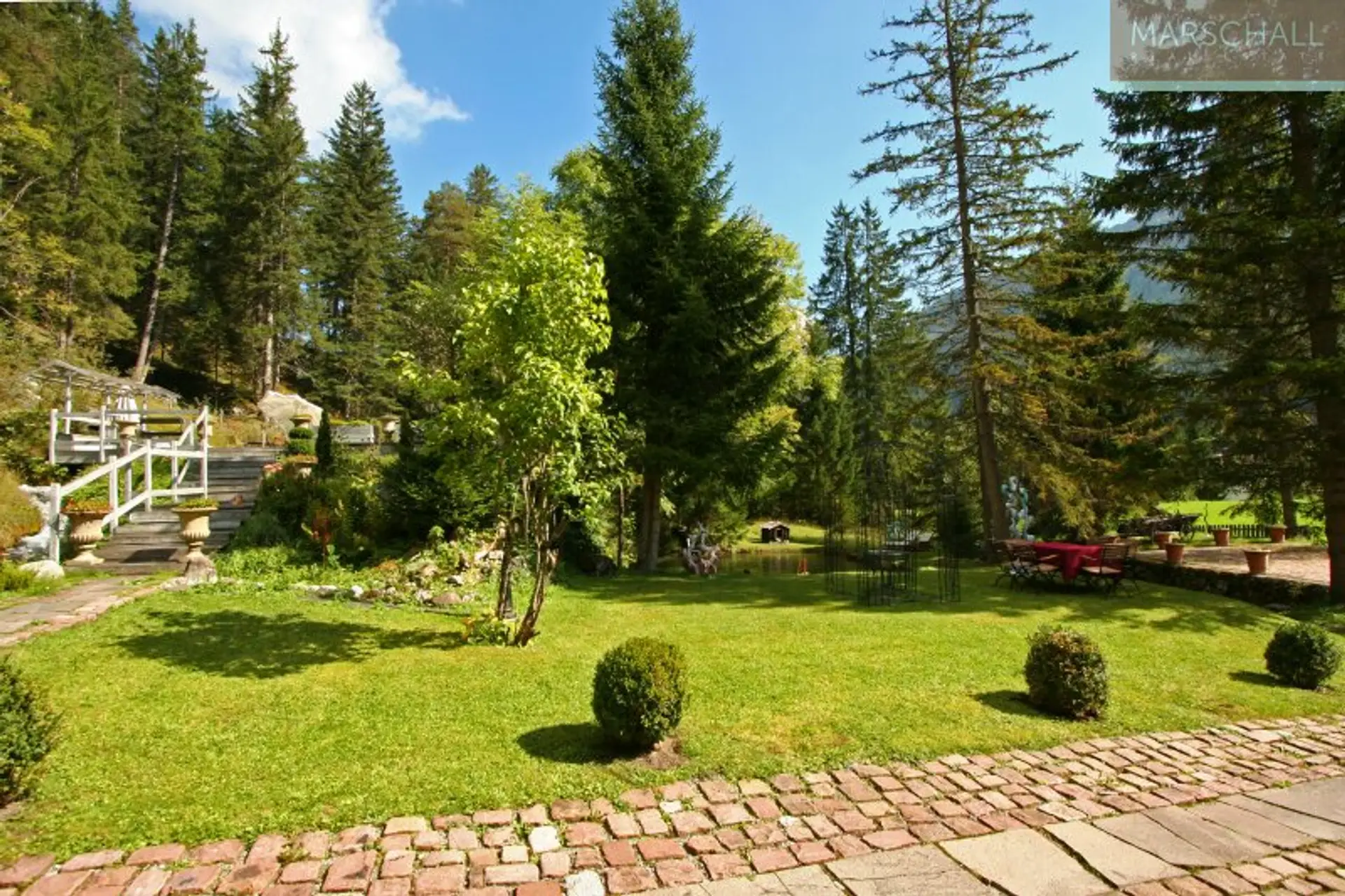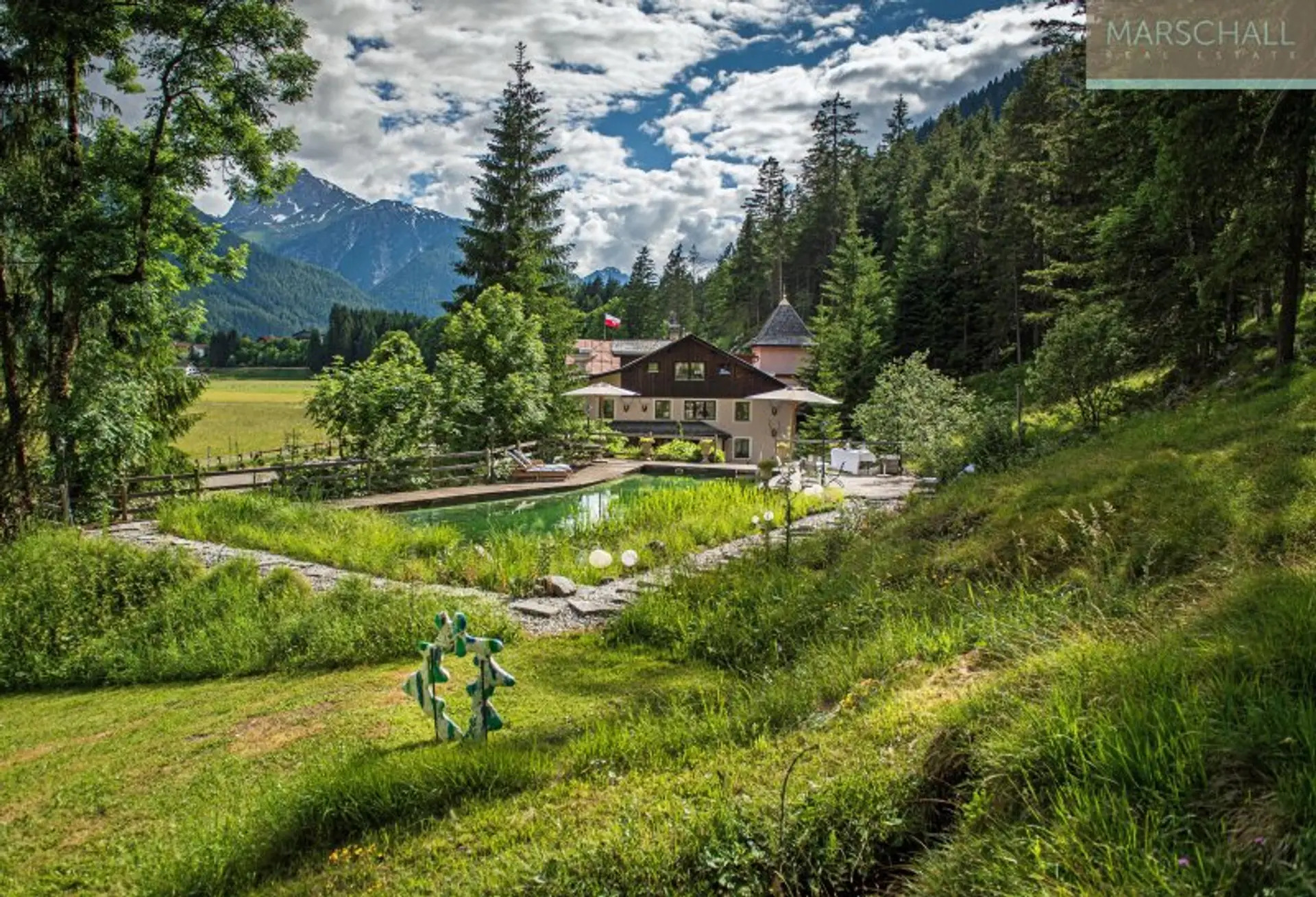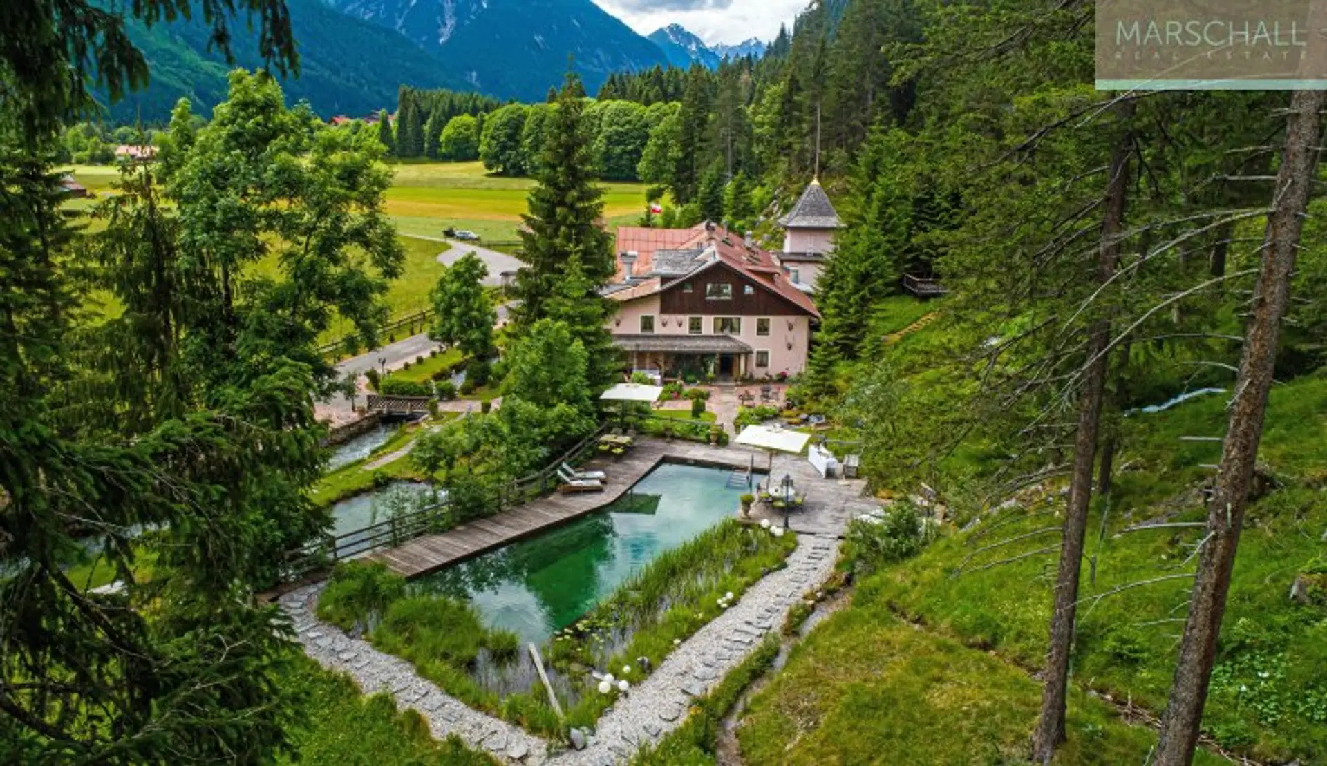 „Wo der Wildbach rauscht“ – so lässt sich das Gesamtensemble mit seiner rund 3.500 m² großen Gartenlandschaft, dem imposanten Haupthaus und seinen Außenanlagen treffend beschreiben. Das Wasser gehört von alters her zu diesem Anwesen; durchquert und umrahmt wird das Grundstück vom einstigen Mühlbach, dem Doserbach und von vier weiteren Wildbächen. Idyllische Ruheplätze sowie ein Schwimmbiotop mit großzügiger Sonnenterrasse, ein Forellenteich sowie urtümliche Bergwälder bilden den Rahmen.