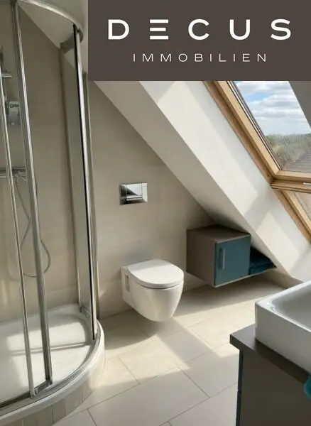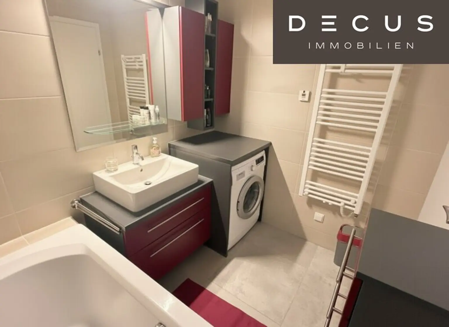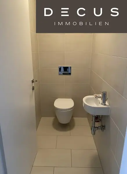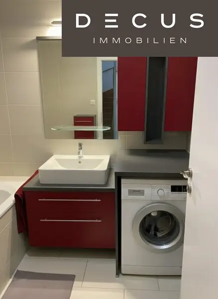 Das Badezimmer ist hochwertig ausgestattet mit Badewanne, Einbaumöbeln, Waschbecken mit Armaturen von Ideal, Handtuchtrockner sowie zusätzlicher elektrischer Fußbodenheizung. Ein Waschmaschinenanschluss ist vorhanden. Das WC ist separat und ebenfalls mit Markenarmaturen ausgestattet.