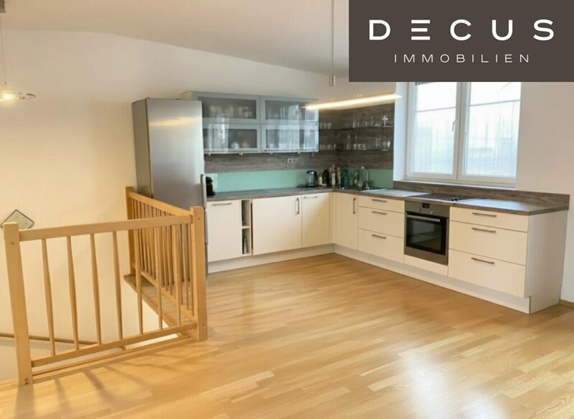 Die obere Ebene präsentiert sich als offener Wohnbereich mit integrierter Küche. Die Einbauküche ist mit Siemens-Geräten (Geschirrspüler, Backofen, Ceranfeld) sowie Armaturen von Blanco ausgestattet.