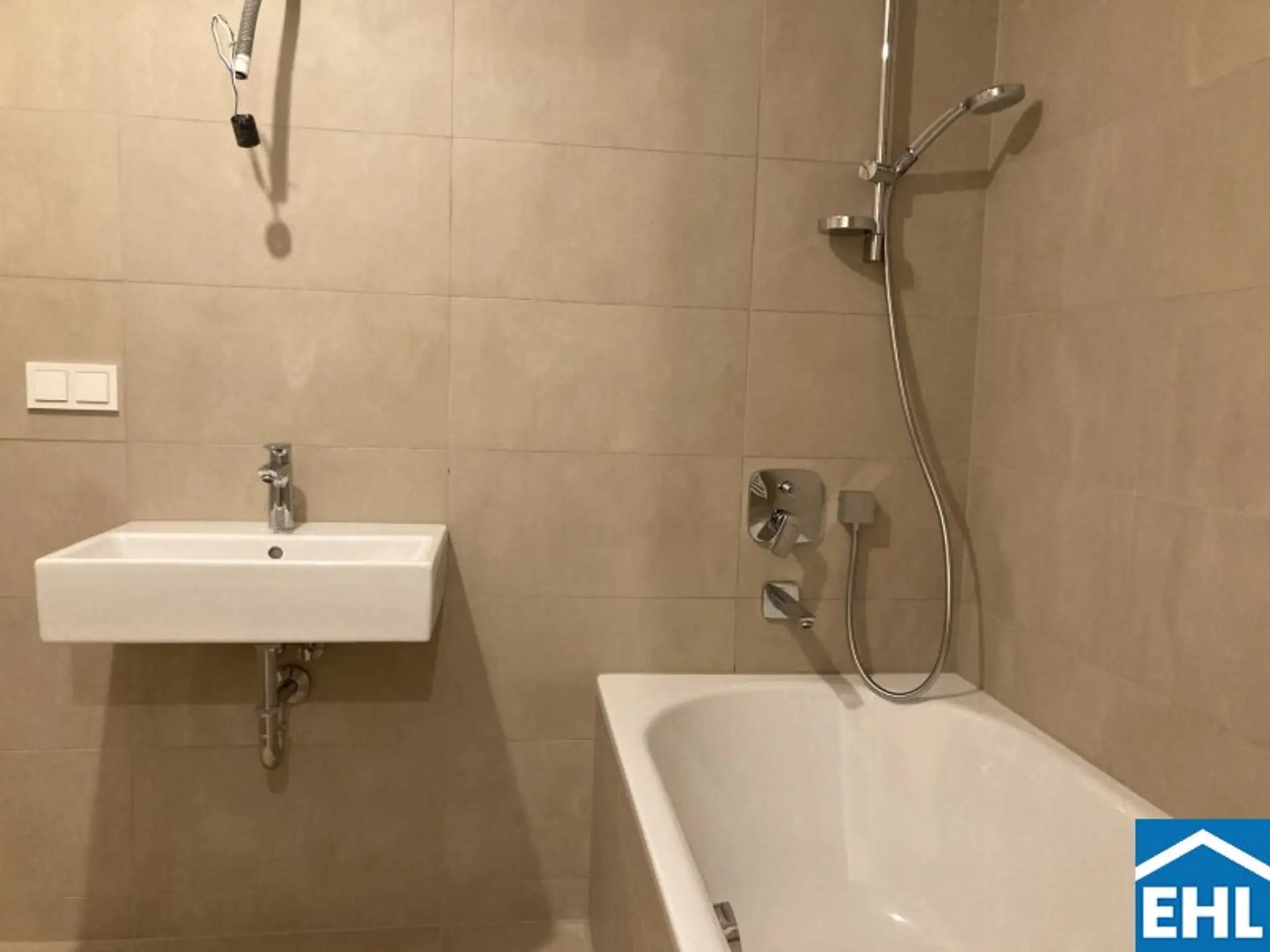* Badezimmer mit Dusche, Toilette und Waschmaschinenanschluss