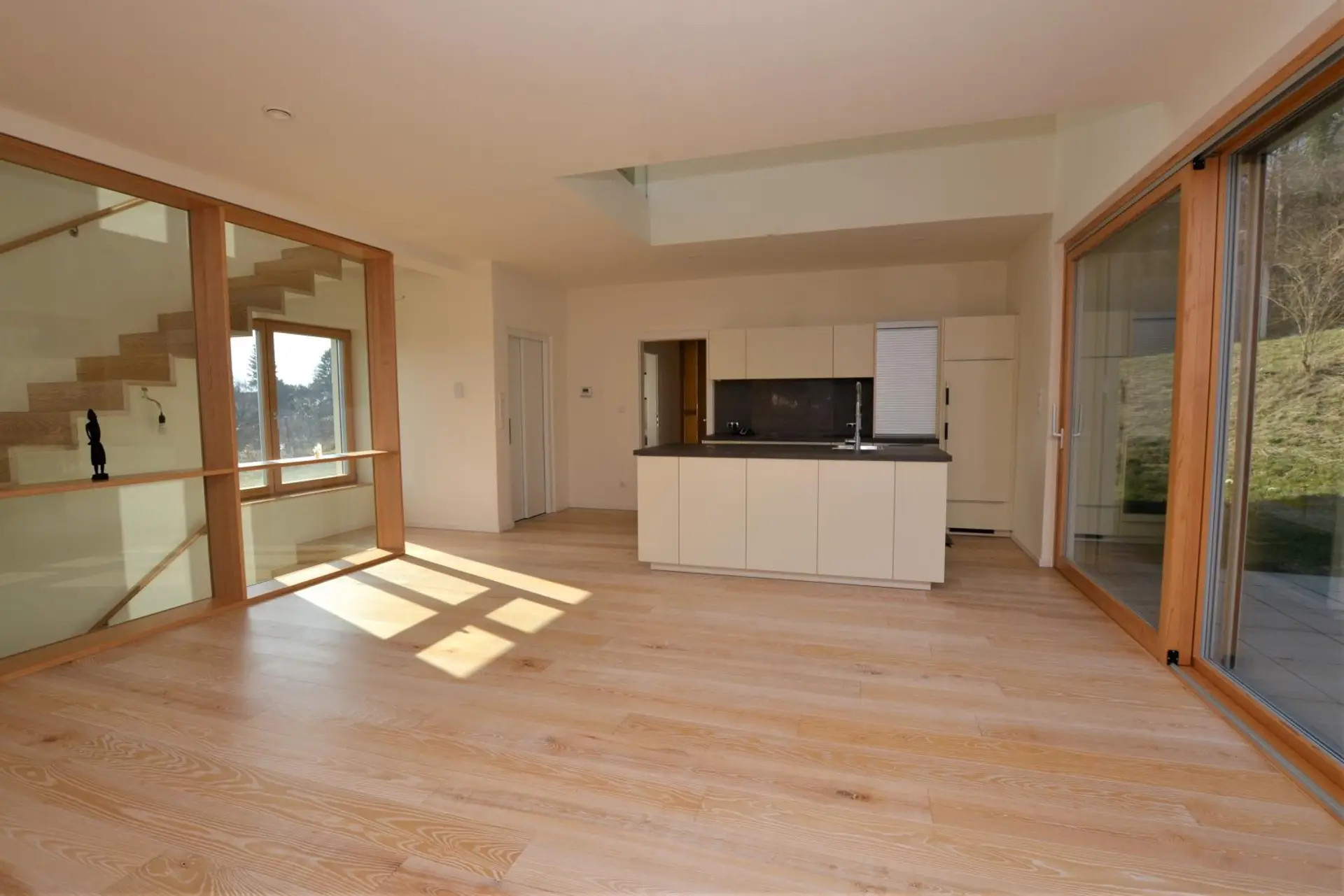 Das moderne Wohnhaus überzeugt durch eine klare Architektur, ein offenes Raumkonzept und eine hochwertige Ausstattung. Edle Materialien wie Glas, Esche und Naturstein prägen das stilvolle Interieur und schaffen ein Wohngefühl, das gleichermaßen elegant wie behaglich wirkt. Große Fensterflächen sorgen für lichtdurchflutete Räume und schaffen eine angenehme Verbindung zwischen Innen- und Außenbereich.