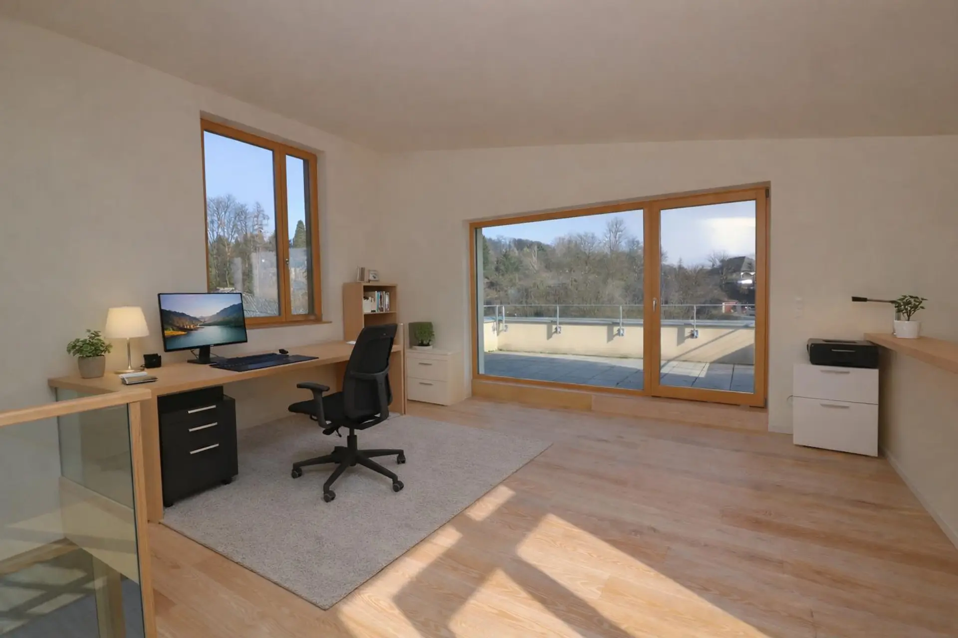 Besonders attraktiv für Paare ist die durchdachte Raumstruktur: Zwei Schlafzimmer, zwei Bäder sowie eine offene Galerie, die sich ideal als Homeoffice, Bibliothek oder Rückzugsbereich nutzen lässt, schaffen ein komfortables Wohnumfeld mit ausreichend Privatsphäre. Von der Galerie aus gelangen Sie auf die großzügige Sonnenterrasse mit Blick in den weitläufigen Garten.