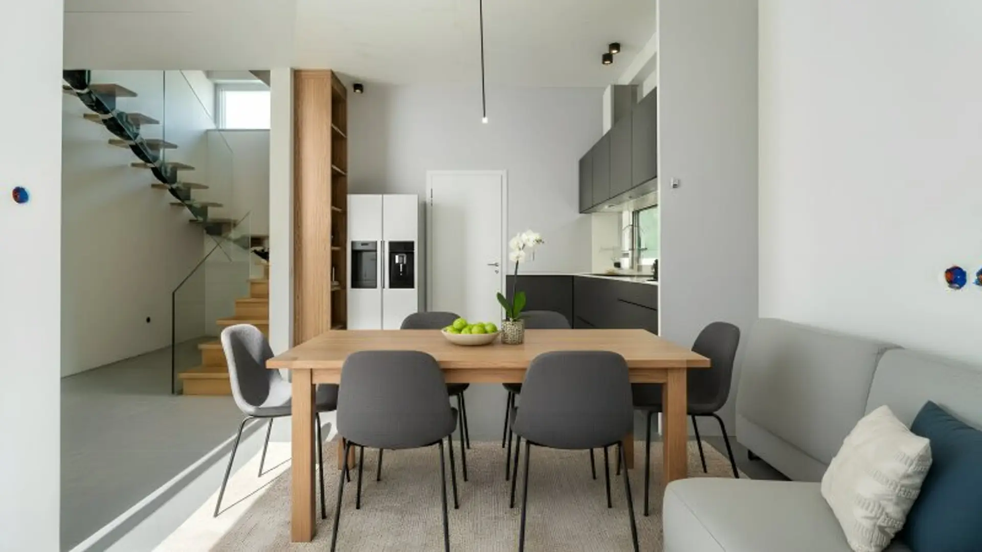 Der Wohn-Essbereich ist lichtdurchflutet und bietet durch große Fensterfronten ein besonderes Wohngefühl. Moderne LED-Lichtschienen im Wohnzimmer setzen stilvolle Akzente. Die Küche ist großzügig geplant und verfügt über eine angrenzende Speis.