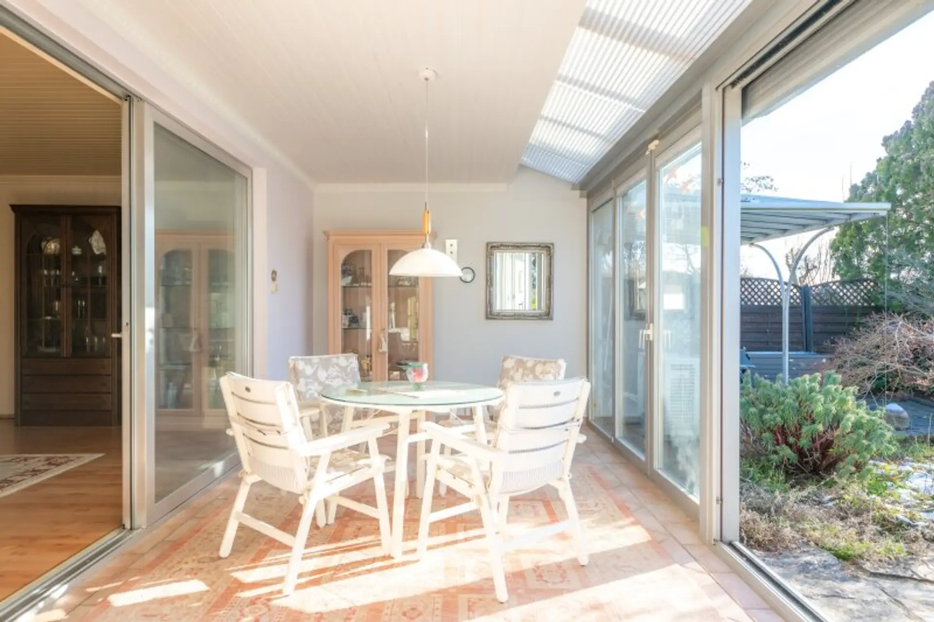 Im Wintergarten können Sie die Sonne genießen, während Sie den Blick über den großen Garten schweifen lassen. Er ist der ideale Ort, um auch in der kühleren Jahreszeit einen überdachten und hellen Bereich nützen zu können, wenn die Gartensaison noch nicht begonnen hat.