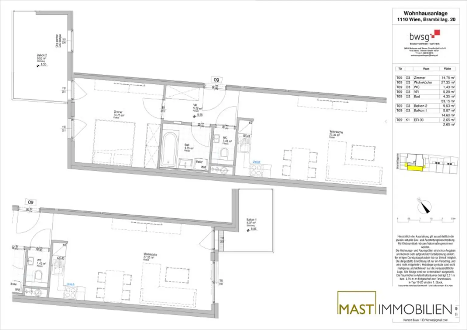 Die Wohnung befindet sich im 3. Liftstock und verfügt über 53,15 m² Wohnfläche + zwei Balkone mit insgesamt 14,60 m².