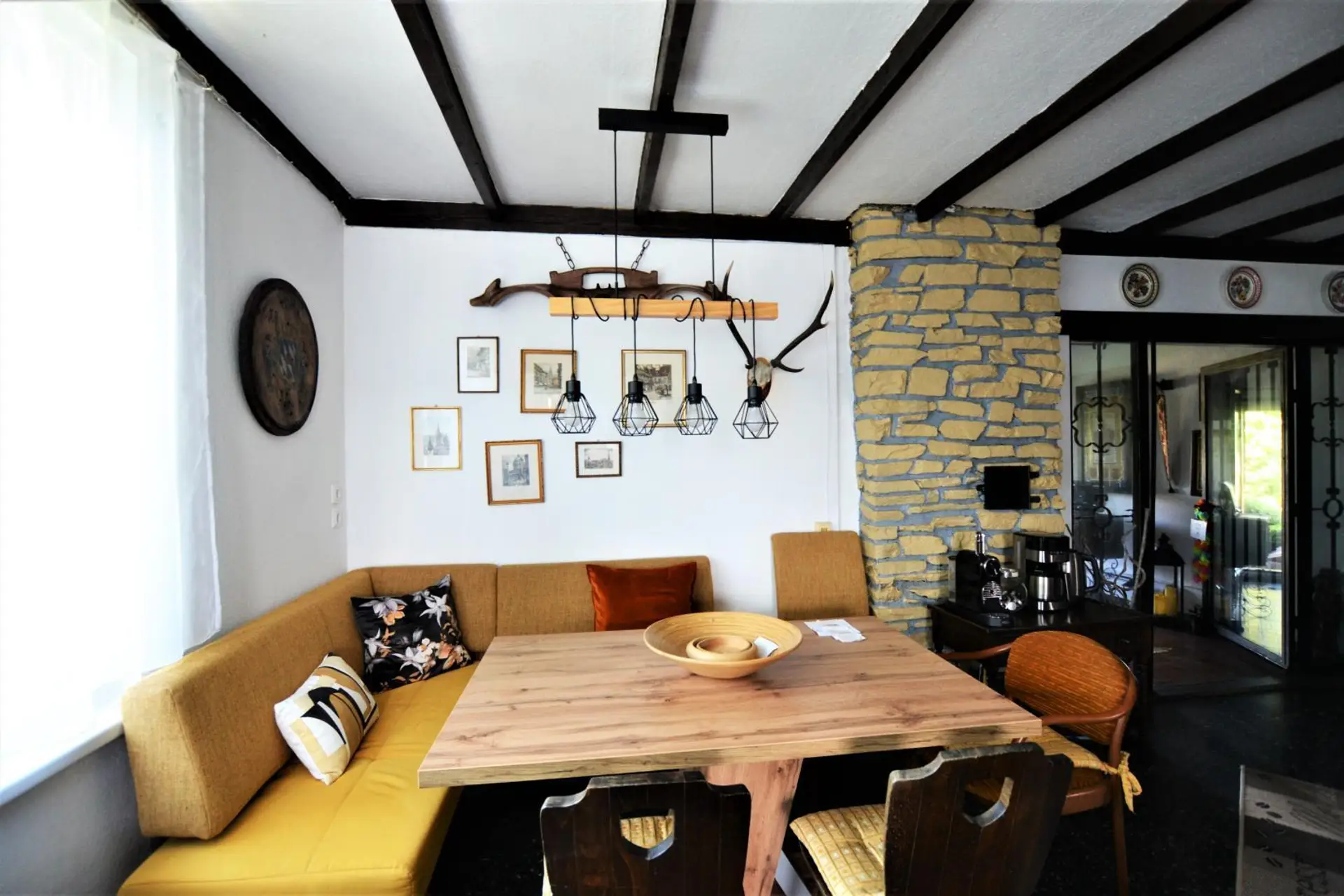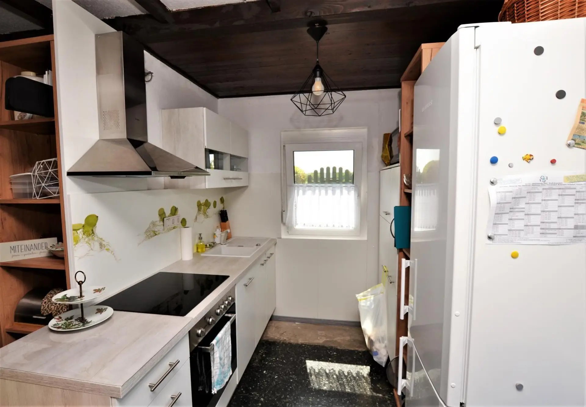 Der offene Wohnbereich lädt mit einer Bar und einem offenen Kamin zu geselligen Stunden und gemütlichen Abenden ein. Die Küche ist zweckmäßig ausgestattet und erfüllt alle Anforderungen für den Alltag. Zwei weitere Zimmer bieten sich als Schlaf-, Gäste- oder Arbeitsraum an. Besonders hervorzuheben ist die großzügige, überdachte Terrasse, die nicht nur Schutz vor Sonne und Wetter bietet, sondern auch einen idealen Ort zum Entspannen mit Blick ins Grüne darstellt.