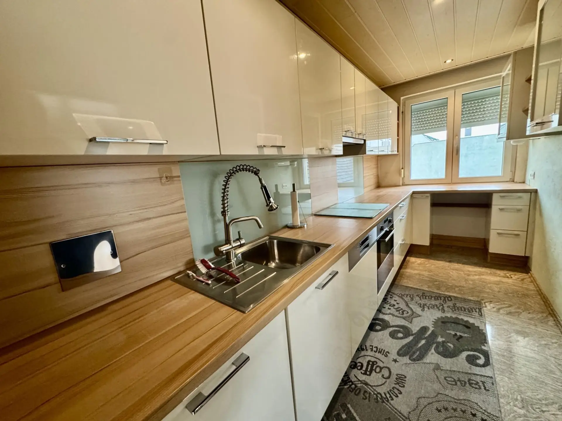 Vom Wohnzimmer aus gelangt man in die separate, modern ausgestattete Küche – ideal für Kochabende und täglichen Komfort.