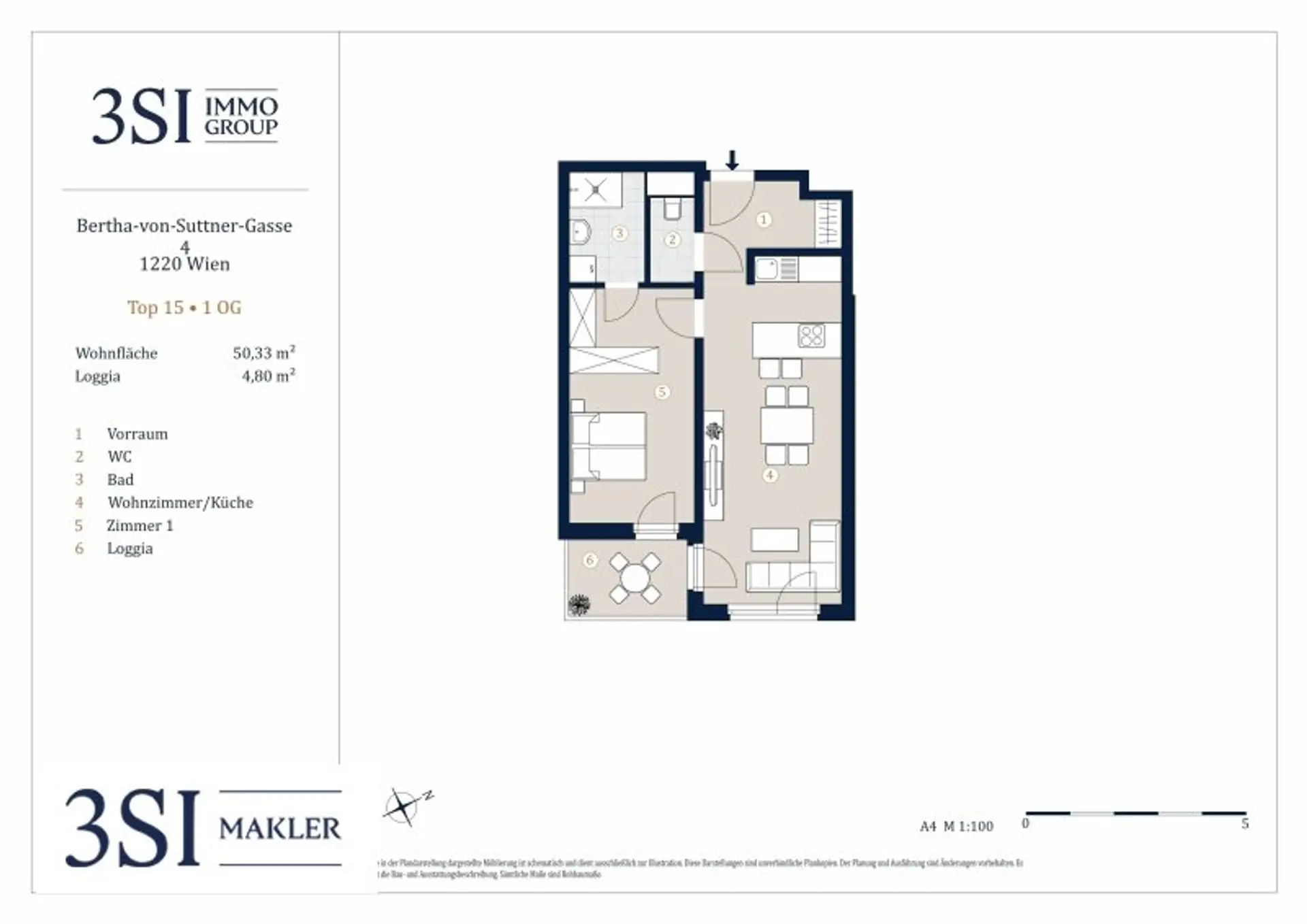 Bereits beim Betreten empfängt ein großzügiger Vorraum, der ausreichend Platz für Garderobe und Stauraum bietet. Der helle Wohn-/Essbereich mit neuwertiger Küche bildet das Herzstück der Wohnung und lädt zum Wohlfühlen ein. Von hier aus gelangen Sie direkt auf die Loggia, die ebenso wie das Schlafzimmer ostseitig ausgerichtet ist und einen schönen Grünblick bietet. Die Loggia ist sowohl vom Wohnbereich als auch vom Schlafzimmer aus begehbar.