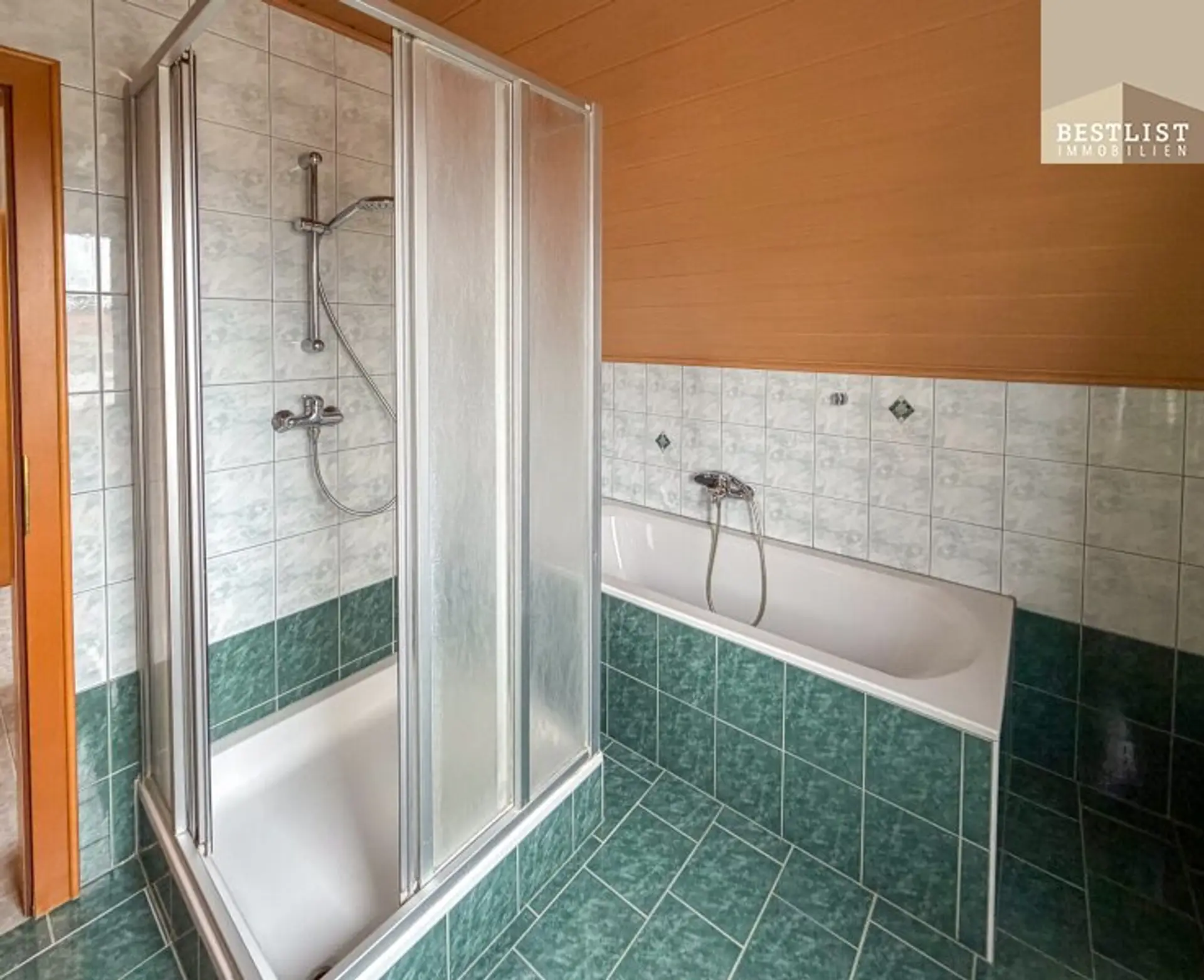 Ein Badezimmer mit Badewanne und Dusche sowie ein separates WC komplettieren diese Wohnebene und unterstreichen die durchdachte Planung des Hauses.