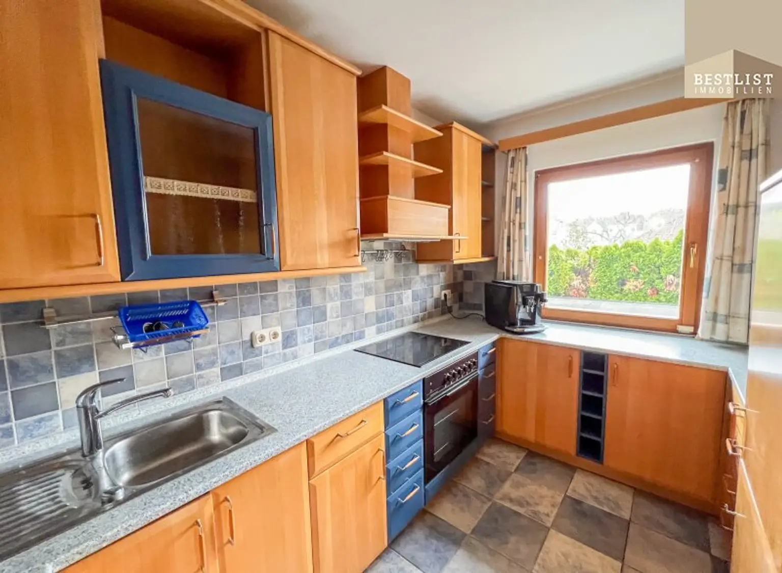 Das Herzstück des Hauses bildet der großzügige Wohnbereich. Großzügige Fensterflächen schaffen ein helles, freundliches Raumgefühl und öffnen den Blick ins Grüne. Von hier aus gelangen Sie sowohl in die separate Küche als auch auf die sonnige Terrasse mit angrenzendem Garten – ein klassisches Setting für Familienleben, gesellige Abende und entspannte Stunden im Freien.