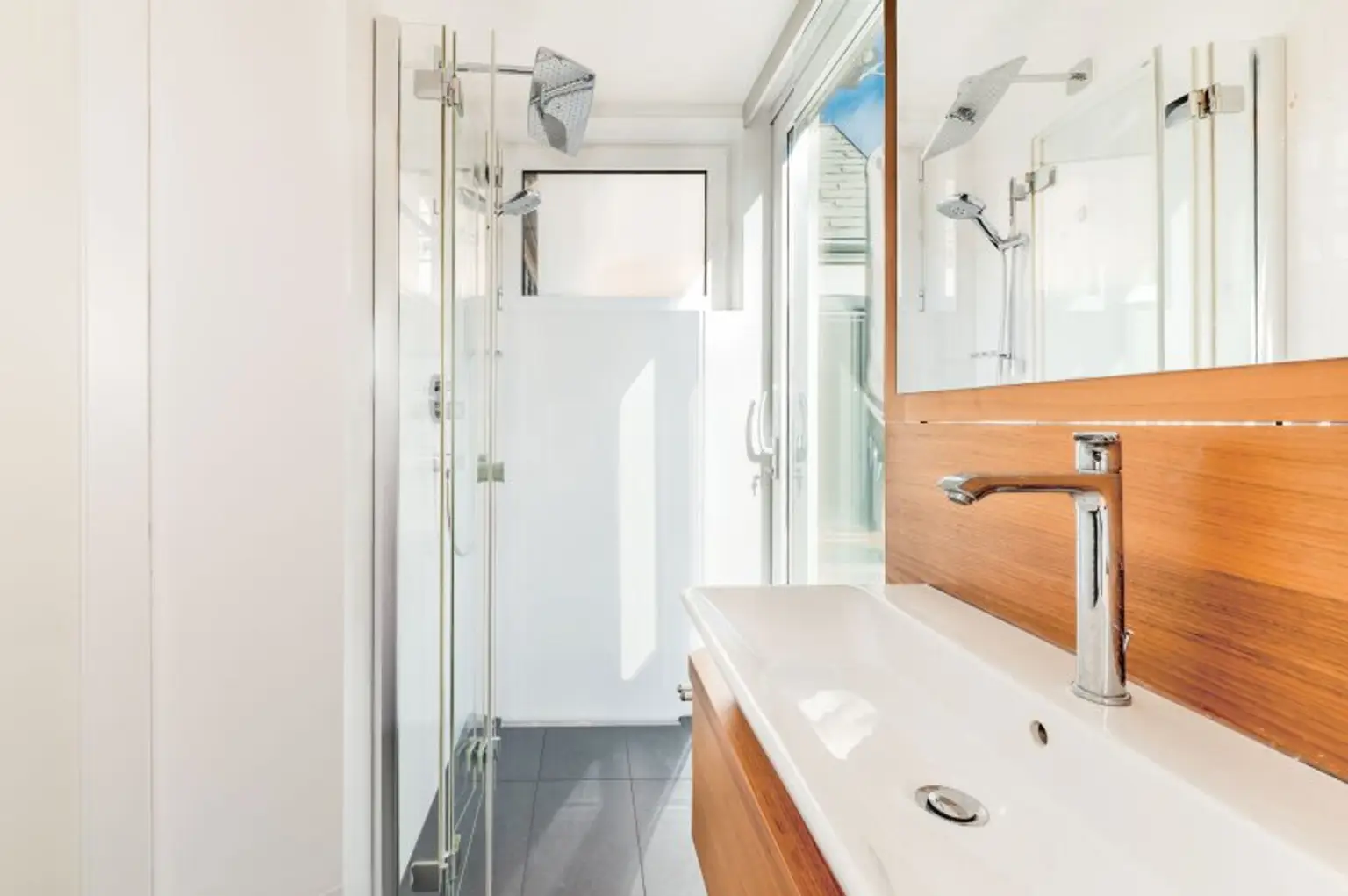 Angrenzend an den Wohnbereich befindet sich ein separates WC, ein praktischer Abstellraum (Fächer bereits eingebaut). Von einem zentralen Gang gelangen Sie in ein helles Dusch-/Wannenbad mit direktem Terrassenausgang von der Dusche. Ein praktisch eingerichteter Schrankraum und ein Schlafzimmer mit einer weiteren Terrasse (ca. 7m²) in den Innenhof runden das Angebot perfekt ab! Im Schlafzimmer gibt es zusätzlich noch eine weitere Ebene mit zusätzlichem Stauraum!