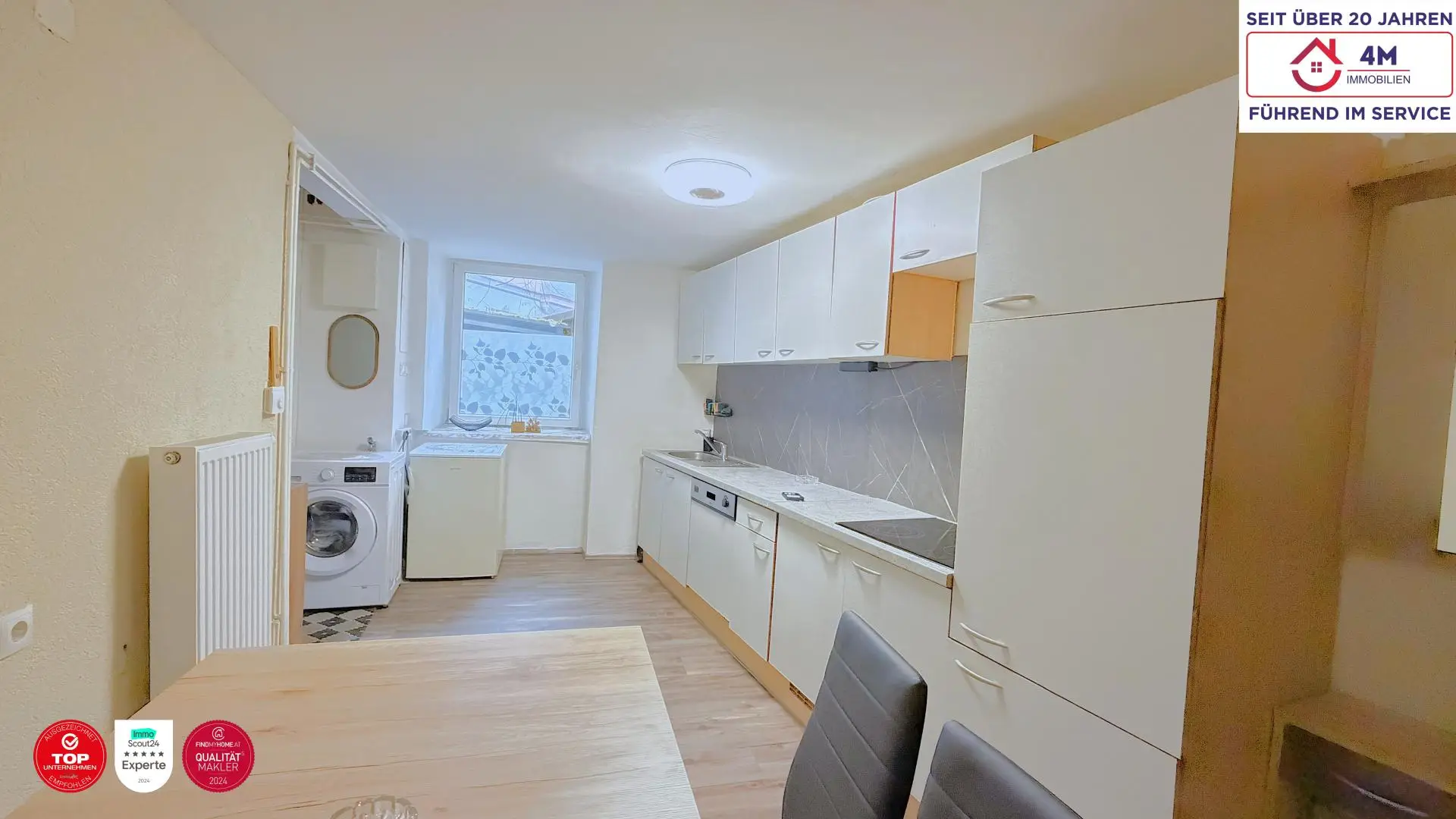 Der helle Wohnraum mit Küche ist hofseitig ausgerichtet und bietet einen angenehmen Blick in den ruhigen Innenhof. Zusätzlich stehen zwei Schlafzimmer zur Verfügung – ideal als Schlaf-, Kinder-, Arbeits- oder Gästezimmer.