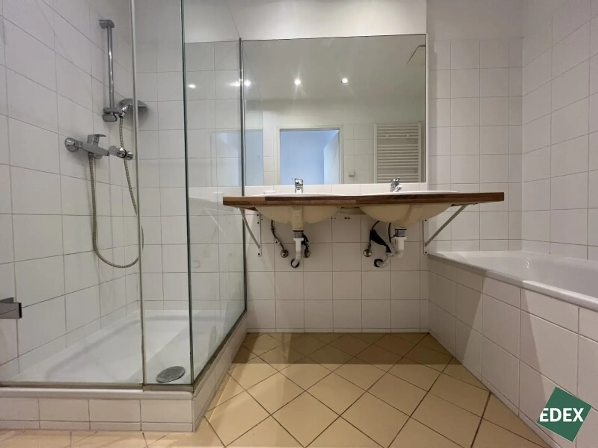 Badezimmer mit Dusche, Badewanne und Doppelwaschbecken
