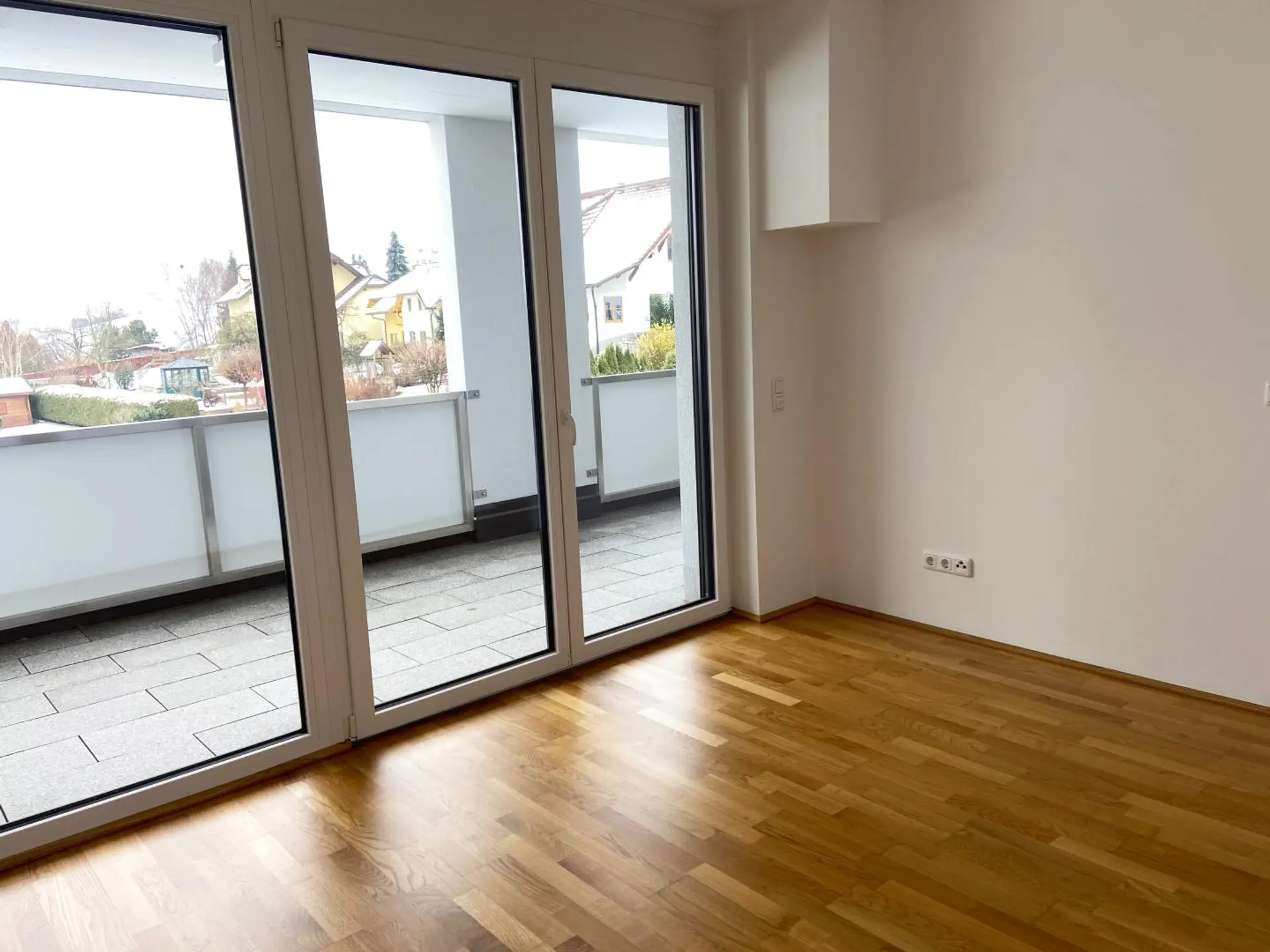 Echtholzboden im Wohn- & Schlafbereich, Feinsteinzeug in der Küche, Bad, WC, Vorraum und Abstellraum