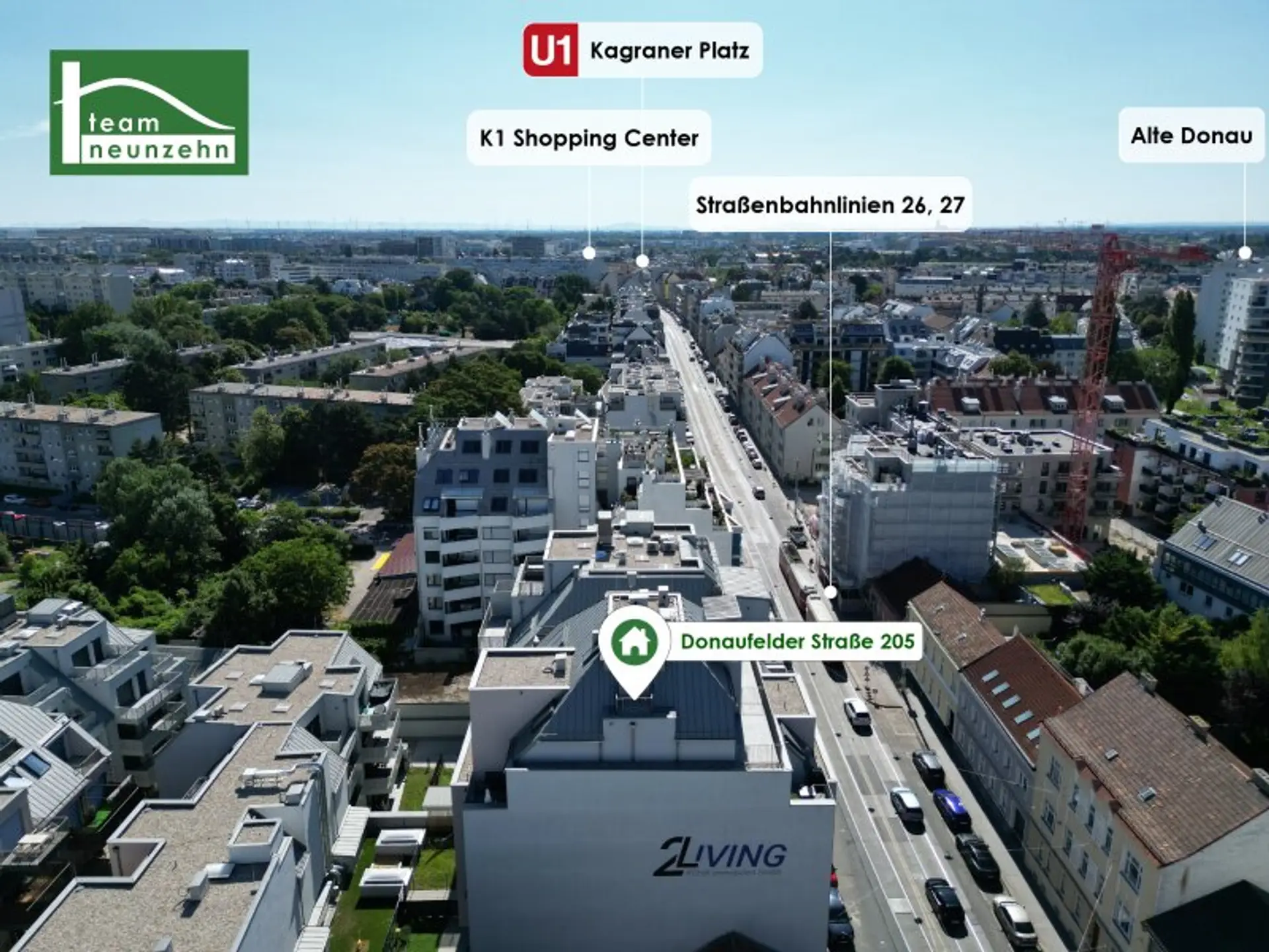 Die ideale Lage des Erstbezugs-Neubau bietet eine hervorragende Anbindung an die Straßenbahnen 25, 26, sowie die Busse 22A und 27A und die U1-Station Kagraner Platz, welche Sie mit den Hot-Spots Wiens verbindet. Die Alte Donau ist in wenigen Autominuten erreichbar und bietet Ihnen durch ihre idyllische Atmosphäre, zahlreichen Restaurants, sowie vielfältigen Sportmöglichkeiten einen perfekten Ort für Ihre Freizeitgestaltung.