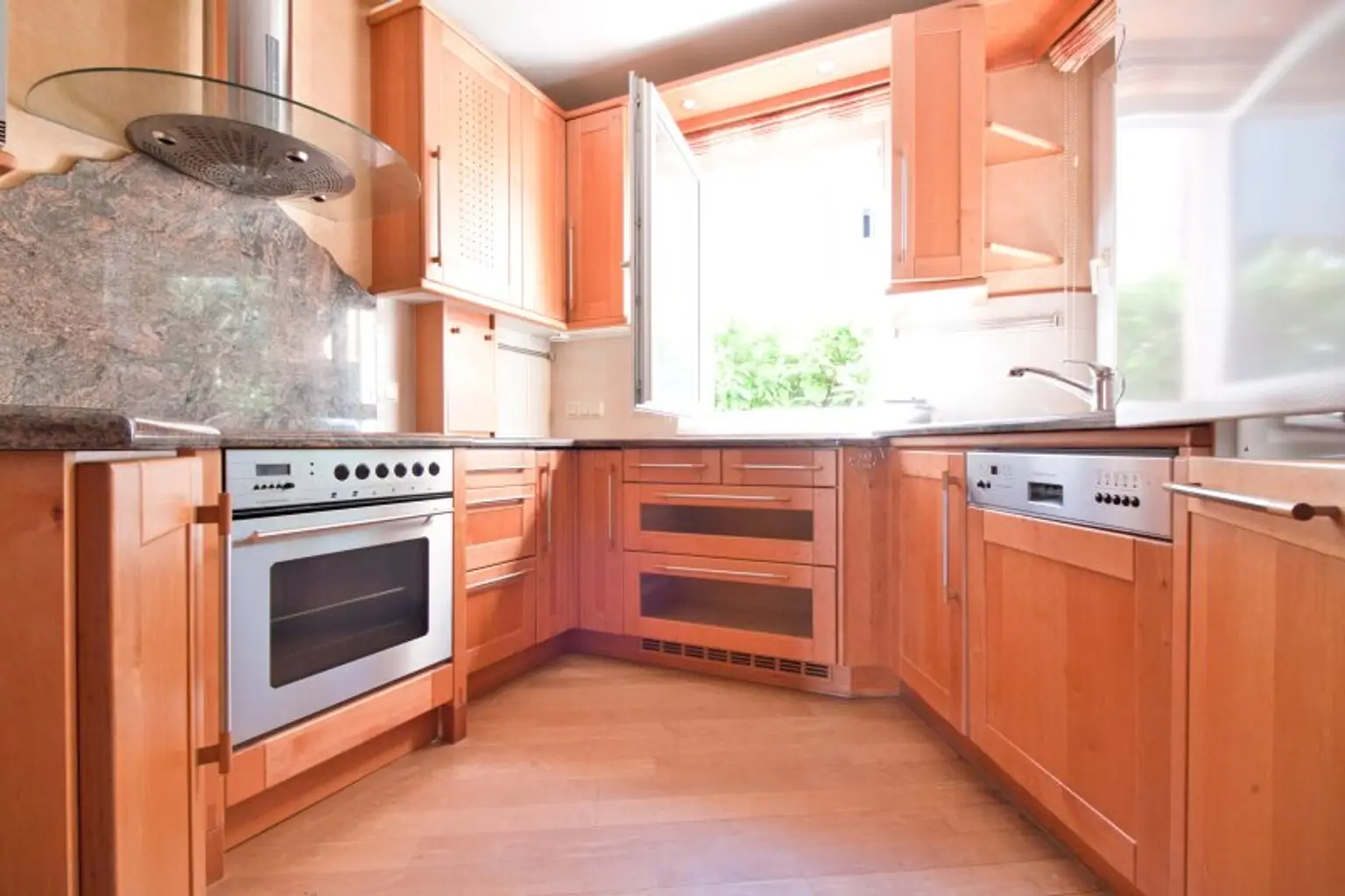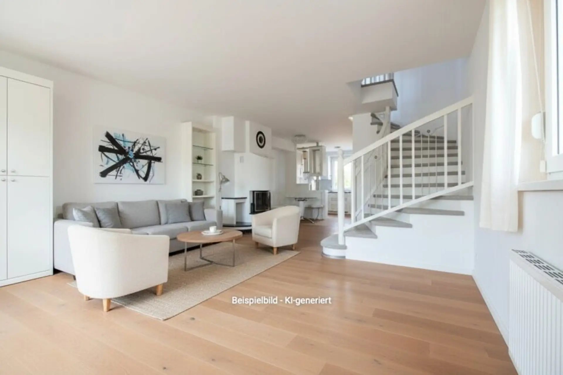 Durch die Eingangstüre gelangt man in einen Vorraum. Durch diesen betritt man die großzügige Wohnküche. Im hinteren Bereich befindet sich eine vollausgestattete, perfekt eingepasste Maß-Küche mit Steinplatte, vorne ist der Wohnbereich untergebracht. Dessen Highlight ist im Winter sicherlich der herrlichen Kamin und im Sommer der Ausgang in den wunderschönen Garten.