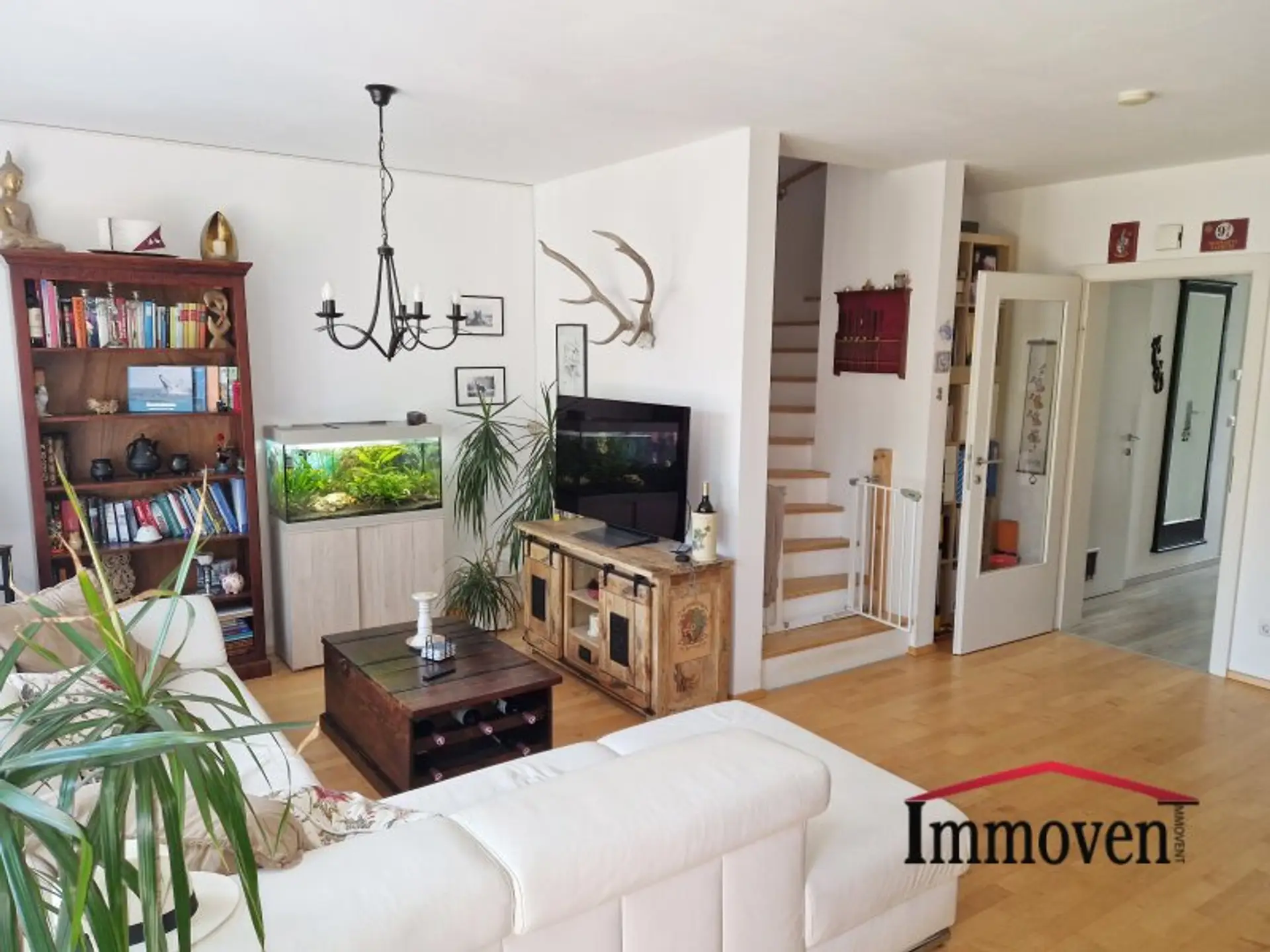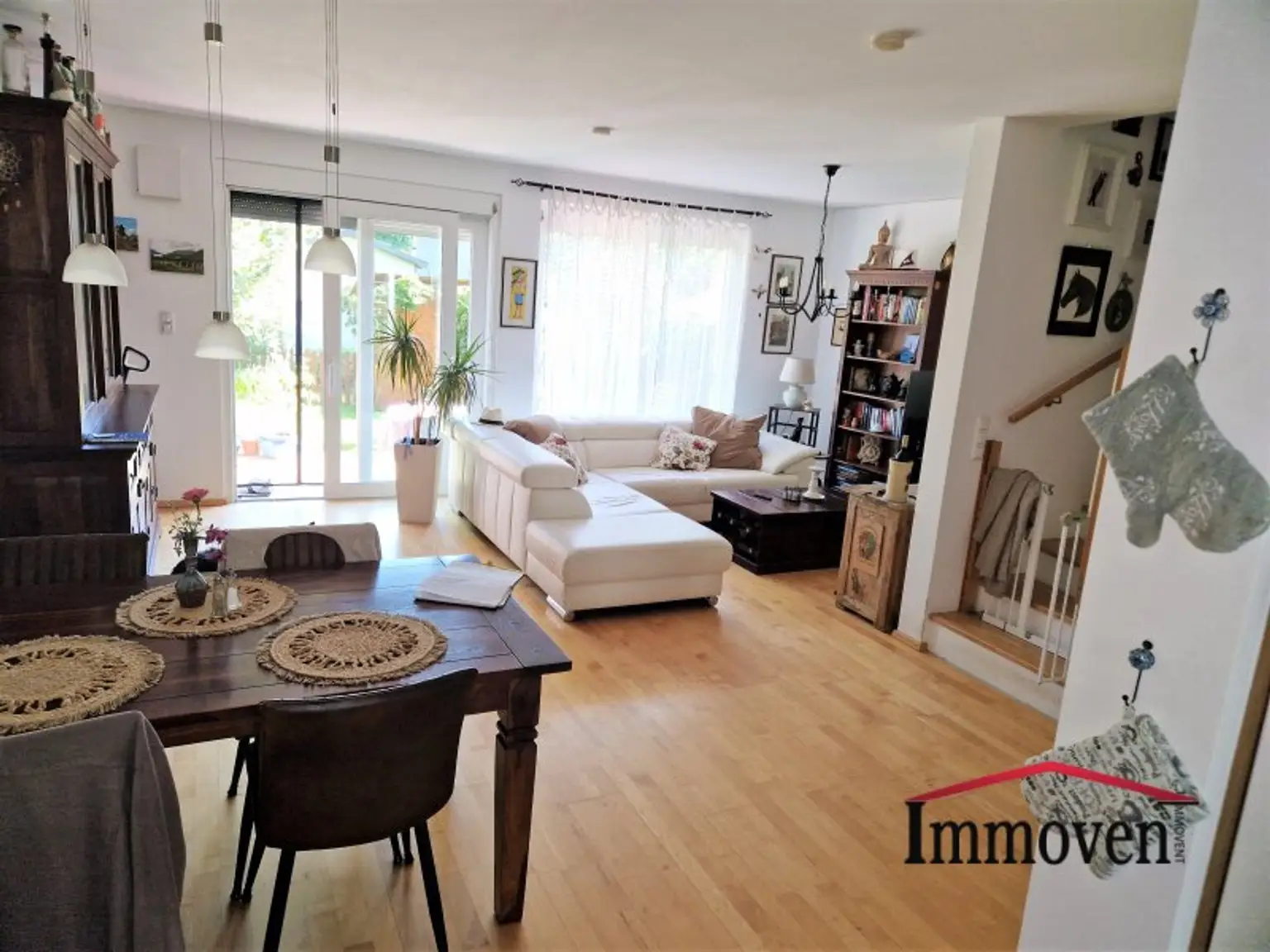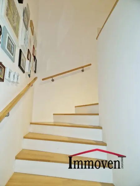 + großer Wohnraum (Fußbodenheizung) mit angrenzender Küche, Stiegenaufgang und Zugang auf die Terrasse und Garten
