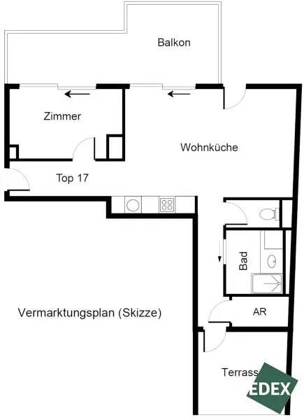 * Top 17             ca. 53,95 m² große 2-Zimmer-Wohnung mit ca. 21,36 m² Balkon/Terrasse: EUR 430.000,-
