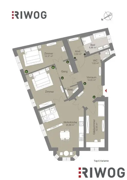 Option: 4-Zimmer Variante durch Verlegung der Küchenzeile ins Wohnzimmer möglich