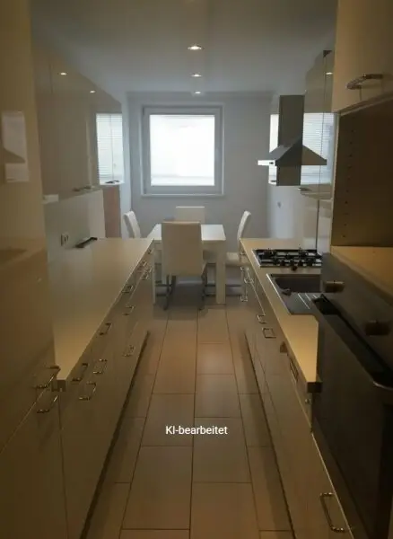 Die weiße Hochglanzküche wurde hochwertig ausgestattet mit einer Kühlschrank-/Tiefkühlkombi, Backrohr und Gasherd. In der Küche gibt es auch Platz für einen kleinen Esstisch.