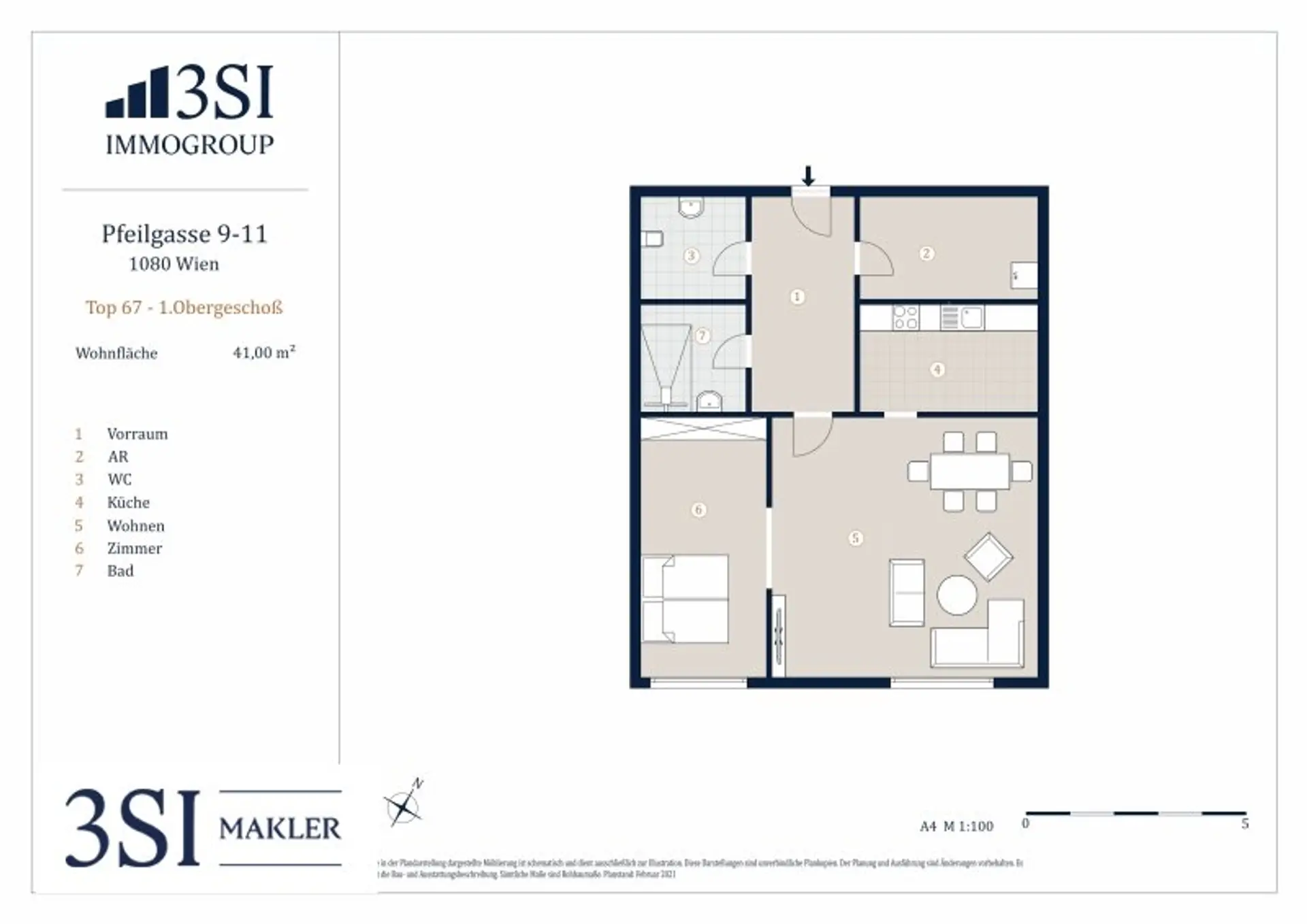 Die Wohnung bietet über das Vorzimmer Zugang zum Badezimmer mit Dusche und Handwaschbecken, dem separaten WC, den Abstellraum mit Waschmaschine sowie den hellen Wohnraum/Schlafraum - welcher Zugang zur neuen Küche bietet.