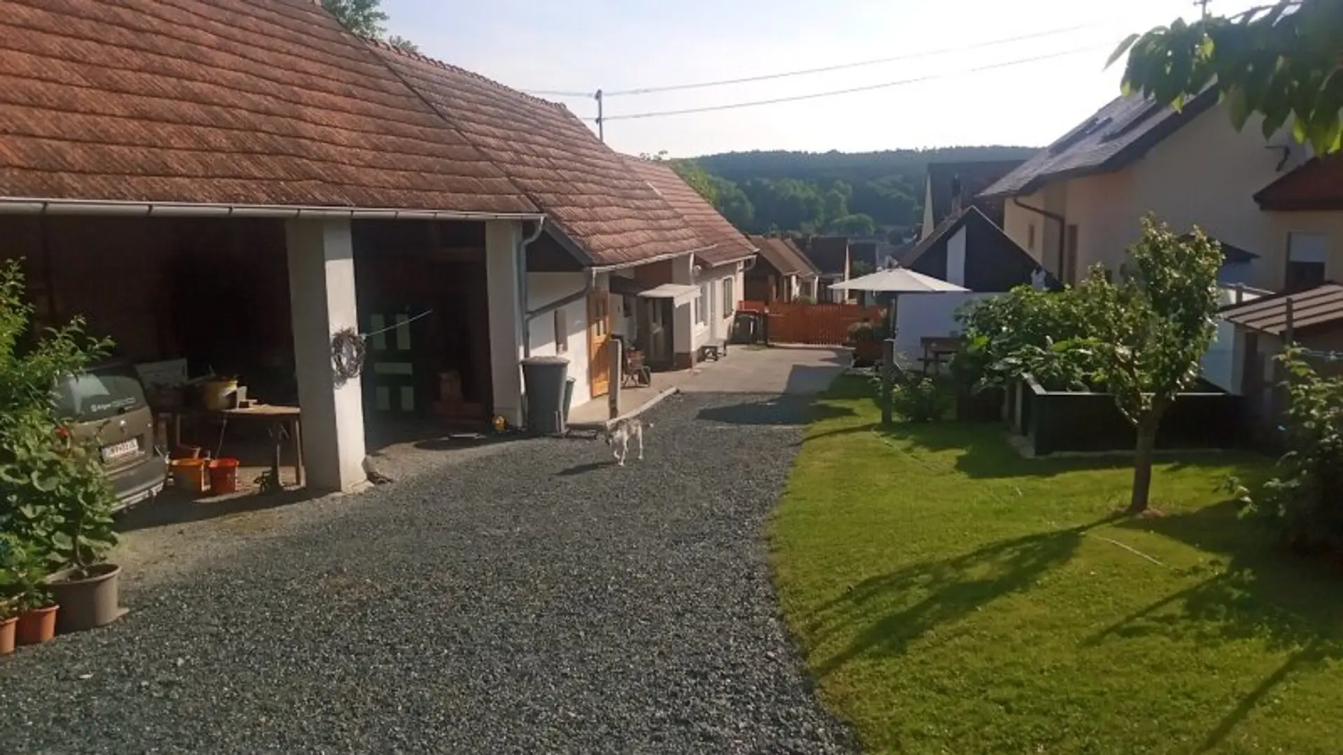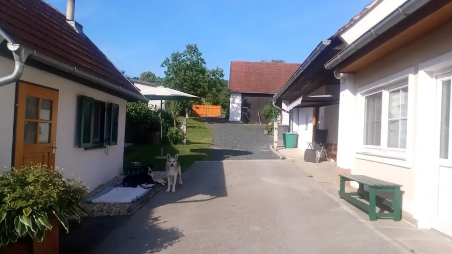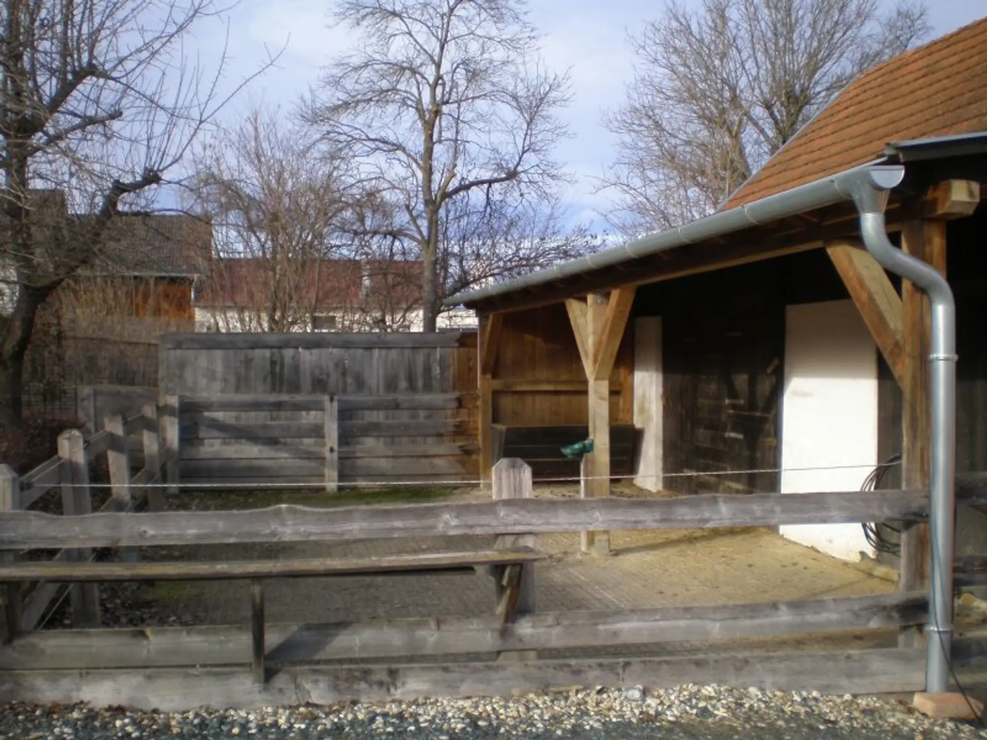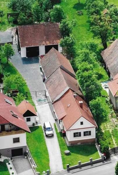 Die Liegenschaft ähnelt einem Streckhof, hat ein großes Einfahrtstor zum Innenhof, einen offenen großen Schuppen, Nebengebäude, eine Pferdekoppel und zwei liebevoll angelegte kleine Erdkeller!